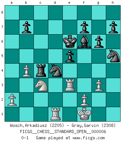 Last move : 0-1 2014 January 14 0:47:56 [Event "FICGS__CHESS__STANDARD_OPEN__000006"] [Site "FICGS"] [Date "2013.07.12"] [Round "1"] [White "Wosch,Arkadiusz"] [Black "Gray,Garvin"] [Result "0-1"] [WhiteElo "2205"] [BlackElo "2308"] 1.e4 c5 2.Nf3 Nc6 3.d4 cxd4 4.Nxd4 e5 5.Nb5 d6 6.Bg5 Qxg5 7.Nc7+ Kd8 8.Nxa8 Nf6 9.Nc3 Nd4 10.h4 Qf4 11.Bd3 Bg4 12.Qd2 Qxd2+ 13.Kxd2 g6 14.Ke1 Kc8 15.Na4 Be6 16.Rd1 Be7 17.c3 Nc6 18.b3 Kb8 19.N8b6 axb6 20.Nxb6 Kc7 21.Na4 d5 22.exd5 Bxd5 23.Kf1 Ra8 24.Rh3 Be6 25.Re3 Ra5 26.c4 Ng4 27.Rh3 Nd4 28.c5 Nf6 29.Re3 Nc6 30.h5 Nxh5 31.Be4 Nd4 32.Bb1 Bf6 33.Nc3 Nf4 34.Be4 Rxc5 35.b4 Rc4 36.g3 Nh5 37.Bd5 Bxd5 38.Nxd5+ Kd6 39.Nc3 Ke6 0-1 Sicilian : Labourdonnais-Loewenthal (Kalashnikov) variation Player Black won this chess game. Follow this game move after move (download)Daring ideas are like Chess men moved forward. They may be beaten, but they may start a winning game. (Johann Wolfgang von Goethe) Schach sollte überall auf der Welt Schulfach werden. Es fördert die geistige Auseinandersetzung. Es lehrt die Demut in der Niederlage. (Garry Kasparov) El jugador táctico debe saber que hacer cuando algo se debe de hacer. El estratégico debe saber que hacer cuando nada se debe de hacer. (Savielly Tartakover) Les Echecs mettent en conflit, non pas deux intelligences, mais deux volontés. (Lasker) Chess is everything: art, science and sport. (Anatoly Karpov)