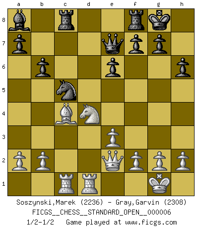 Last move : 1/2-1/2 2013 October 5 10:55:7 [Event "FICGS__CHESS__STANDARD_OPEN__000006"] [Site "FICGS"] [Date "2013.07.12"] [Round "1"] [White "Soszynski,Marek"] [Black "Gray,Garvin"] [Result "1/2-1/2"] [WhiteElo "2236"] [BlackElo "2308"] 1.d4 d5 2.c4 c6 3.Nf3 e6 4.Nc3 Nf6 5.Bg5 h6 6.Bxf6 Qxf6 7.e3 Bd6 8.Bd3 Qe7 9.O-O Nd7 10.Qc2 dxc4 11.Bxc4 O-O 12.Ne4 b6 13.Nxd6 Qxd6 14.Rfd1 Bb7 15.Rac1 Qe7 16.Bd3 Rac8 17.Qe2 Ba8 18.Ba6 Rcd8 19.Bc4 c5 20.dxc5 Nxc5 21.Nd4 Rc8 1/2-1/2 QGD Slav : 3.Nf3 Kingside Castling by player White (move 9) Kingside Castling by player Black (move 11) This chess game ended in a draw. Follow this game move after move (download)The combination player thinks forward; he starts from the given position, and tries the forceful moves in his mind. (Emanuel Lasker) Der Bart als Geschlechtszeichen mitten im Gesicht ist obszön. Daher gefällt er den Weibern. [Zugegeben, kein Schachzitat, aber unglaublich originell] (Arthur Schopenhauer) Nos gusta pensar. (Gary Kasparov) Tous ces prétendus hommes politiques sont les pions, les Cavaliers, les Tours ou les Fous d'une partie d'échecs qui se jouera tant qu'un hasard ne renversera pas l'échiquier. (Honoré de Balzac) The ego is not master in its own house. (Sigmund Freud)
