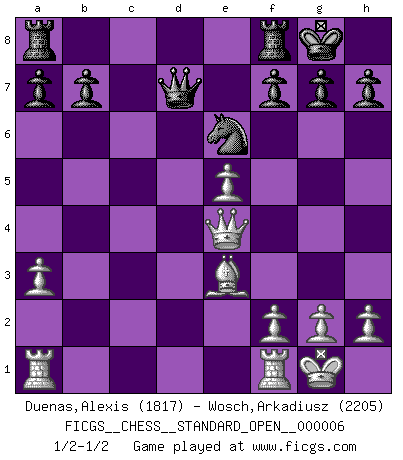 Last move : 1/2-1/2 2013 October 23 9:51:54 [Event "FICGS__CHESS__STANDARD_OPEN__000006"] [Site "FICGS"] [Date "2013.07.12"] [Round "1"] [White "Duenas,Alexis"] [Black "Wosch,Arkadiusz"] [Result "1/2-1/2"] [WhiteElo "1817"] [BlackElo "2205"] 1.d4 Nf6 2.c4 e6 3.Nc3 Bb4 4.Qc2 O-O 5.e4 d5 6.e5 Ne4 7.Bd3 c5 8.a3 Bxc3+ 9.bxc3 cxd4 10.cxd5 exd5 11.cxd4 Nc6 12.Ne2 Bg4 13.O-O Bxe2 14.Qxe2 Nxd4 15.Qe3 Ne6 16.Bxe4 dxe4 17.Qxe4 Qd7 18.Be3 1/2-1/2 Nimzo-Indian : Classical variation Kingside Castling by player Black (move 4) Kingside Castling by player White (move 13) This chess game ended in a draw. Follow this game move after move (download)Adequate compensation for a sacrifice is having a sound combination leading to a winning position; adequate compensation for a blunder is having your opponent snatch defeat from the jaws of victory. (Bruce A. Moon) Schach ist gnadenlos. Du mußt bereit sein zu töten. (Nigel Short) No hay precio que no valga la pena por la cabellera del Rey enemigo. (Koblentz) Tout change constamment, y compris dans le monde des Echecs. (Botvinnik) Thus, what is of supreme importance in war is to attack the enemy's strategy. (Sun Tzu)