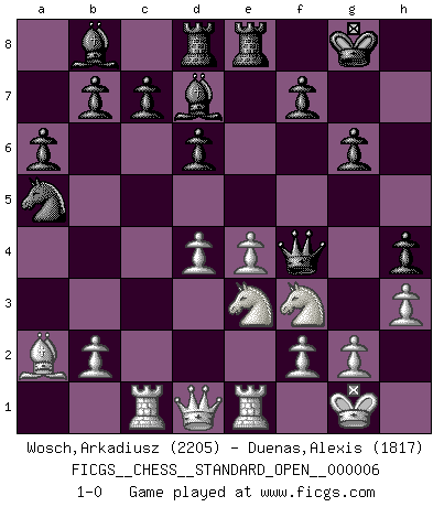 Last move : 1-0 2013 November 28 13:47:27 [Event "FICGS__CHESS__STANDARD_OPEN__000006"] [Site "FICGS"] [Date "2013.07.12"] [Round "2"] [White "Wosch,Arkadiusz"] [Black "Duenas,Alexis"] [Result "1-0"] [WhiteElo "2205"] [BlackElo "1817"] 1.e4 e5 2.Nf3 Nc6 3.Bc4 Bc5 4.c3 Nf6 5.d3 d6 6.O-O h6 7.h3 O-O 8.Bb3 a6 9.Re1 Ba7 10.Nbd2 Nh5 11.Nf1 Qf6 12.Be3 Nf4 13.Ng3 g6 14.d4 h5 15.a4 Re8 16.a5 h4 17.Nf1 exd4 18.Bxf4 Qxf4 19.cxd4 Bd7 20.Rc1 Rad8 21.Bd5 Bb8 22.Ne3 Nxa5 23.Ba2 1-0 Giuoco Piano Kingside Castling by player White (move 6) Kingside Castling by player Black (move 7) Player White won this chess game. Follow this game move after move (download)Weak points or holes in the opponent's position must be occupied by pieces not Pawns. (Siegbert Tarrasch) Bogoljubow: Matt in vier Zügen! Tartakower: Ich verbitte mir jede Belästigung! (Savielly Grigorievitsch Tartakower) La caracteristica mas importante en la posición del Ajedrez es la actividad de las piezas. Esto es absolutamente fundamental en todas las fases del juego: Apertura, Juego Medio y especialmente Finales. La limitación primordial en la actividad de una pieza, es la estructuración de los Peones. (Michael Stean) Le thème de l'attaque double intervient d'une manière ou d'une autre dans l'immense majorité des combinaisons. (Youri Averbakh) Mac users swear by their computers. PC users swear at their computers. (Author unknown)