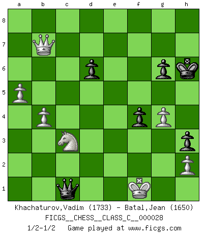 Last move : 1/2-1/2 2007 March 1 15:37:29 [Event "FICGS__CHESS__CLASS_C__000028"] [Site "FICGS"] [Date "2007.02.04"] [Round "1"] [White "Khachaturov,Vadim"] [Black "Batal,Jean"] [Result "1/2-1/2"] [WhiteElo "1733"] [BlackElo "1650"] 1.d4 Nf6 2.c4 c5 3.d5 d6 4.Nc3 e5 5.e4 Be7 6.Nge2 a6 7.Ng3 g6 8.f4 exf4 9.Bxf4 Nbd7 10.Be2 h5 11.O-O h4 12.Nh1 Nh5 13.Bxh5 Rxh5 14.Nf2 Nb6 15.Qe2 Bf6 16.e5 Bxe5 17.Nfe4 Kf8 18.a4 Qe7 19.a5 Nd7 20.Rae1 Kg8 21.Qd2 f5 22.Bxe5 Nxe5 23.Nxc5 h3 24.g3 Qc7 25.Nd3 Nxd3 26.Qxd3 Bd7 27.b4 Rh7 28.c5 Rc8 29.c6 bxc6 30.Qxa6 Rf7 31.Rf4 Re8 32.Rxe8+ Bxe8 33.dxc6 Bxc6 34.Rc4 Qe7 35.Kf2 Bb7 36.Qb6 Qe6 37.Rc7 f4 38.Rxf7 Qxf7 39.Qd8+ Kg7 40.g4 Qe6 41.Qc7+ Kh6 42.Qxb7 Qe3+ 43.Kf1 Qc1+ 44.Kf2 Qe3+ 45.Kf1 Qc1+ 46.Kf2 Qe3+ 47.Kf1 Qc1+ 48.Kf2 Qe3+ 49.Kf1 Qc1+ 1/2-1/2 Comment by player 1 : Vadim Khachaturov : how many cheks u gonna make before u agree its a draw? Comment by player 2 : Jean Batal : I already offered draw in the 42th move. You have to accept the draw by selecting "Accept Draw" button (if I am not mistaken). Benoni defense, Hromodka system Kingside Castling by player White (move 11) This chess game ended in a draw. Follow this game move after move (download)Examine moves that smite! A good eye for smites is far more important than a knowledge of strategical principles. (Purdy) Ich organisiere ein großes Turnier, was mich etwa 120000 Dollar kostet. Ich denke, das ist das erste Mal in der Schachgeschichte, daß ein Schachgroßmeister auch als Mäzen auftritt. (Miguel Najdorf) El Ajedrez te enseña a controlarl la excitación inicial que sientes cuando vez algo que parece bueno y te enseña a pensar objetivamente cuando te encuentras en problemas. (Stanley Kubrick) Les échecs, c'est l'art d'analyser. (Mikhail Botvinnik) Winning isn't everything... but losing is nothing. (Mednis)
