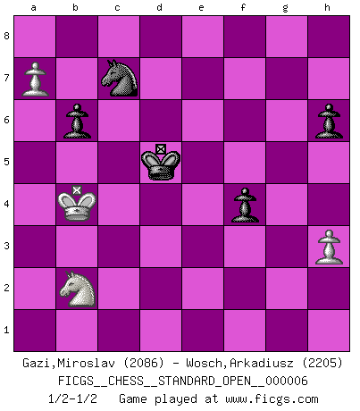 Last move : 1/2-1/2 2014 September 16 11:17:37 [Event "FICGS__CHESS__STANDARD_OPEN__000006"] [Site "FICGS"] [Date "2013.07.12"] [Round "2"] [White "Gazi,Miroslav"] [Black "Wosch,Arkadiusz"] [Result "1/2-1/2"] [WhiteElo "2086"] [BlackElo "2205"] 1.d4 Nf6 2.Bg5 Ne4 3.Bf4 c5 4.f3 Qa5+ 5.c3 Nf6 6.Nd2 cxd4 7.Nb3 Qb6 8.Qxd4 Nc6 9.Qxb6 axb6 10.Nd4 e5 11.Nxc6 exf4 12.Nd4 Bc5 13.g3 Bxd4 14.cxd4 Ra4 15.gxf4 Nd5 16.Kf2 Rxd4 17.e4 Nxf4 18.Ke3 Ne6 19.Ne2 Rb4 20.b3 d5 21.exd5 Nc7 22.Nc3 Rh4 23.Rd1 Kd8 24.Kf2 Bd7 25.Ne4 Ne8 26.Kg3 Rh5 27.Rd4 Rg8 28.h3 g5 29.Nc3 Nd6 30.Rb4 Rg6 31.Bg2 Rh4 32.Rxh4 Nf5+ 33.Kf2 Nxh4 34.Re1 h6 35.Bf1 Rf6 36.Re3 Rf5 37.a3 Ng6 38.Bd3 Re5 39.Bf1 Rxe3 40.Kxe3 Ke7 41.b4 f5 42.Kd4 Nh4 43.f4 gxf4 44.Ke5 Ng6+ 45.Kd4 f3 46.Ke3 Kd6 47.Kxf3 Ke5 48.Kf2 Ne7 49.Bg2 Nc8 50.Ne2 Nd6 51.Kg3 Ne4+ 52.Kf3 Nf6 53.Nf4 Nxd5 54.Ng6+ Kf6 55.Nf4 Nc3 56.Ke3 Bc6 57.Bxc6 bxc6 58.Nd3 Nd5+ 59.Kd4 Ke6 60.Nb2 Ne7 61.a4 Nd5 62.a5 c5+ 63.Kc4 f4 64.a6 cxb4 65.a7 Nc7 66.Kxb4 Kd5 1/2-1/2 Trompowsky attack (Ruth, Opovcensky Opening) 10 pieces endgame at move 64 : White KNPP , Black KNPPPP WHITE : King + 1 Knight 2 Pawns BLACK : King + 1 Knight 4 Pawns 9 pieces endgame at move 66 : White KNPP , Black KNPPP WHITE : King + 1 Knight 2 Pawns BLACK : King + 1 Knight 3 Pawns This chess game ended in a draw. Follow this game move after move (download)Life is a kind of Chess, with struggle, competition, good and ill events. (Benjamin Franklin) Woher wissen wir, daß der Neanderthaler Blindschach gespielt hat? -- Bei Ausgrabungen wurden keine Schachbretter und Figuren gefunden. (Anonymous) No es una movida, aún la mejor movida que tu debas buscar, sino un plan comprensible. (Eugene Znosko-Borovsky) Le génie consiste à savoir transgresser les règles au moment opportun. (Teichmann) Industry executives and analysts often mistakenly talk about strategy as if it were some kind of chess match. But in chess, you have just two opponents, each with identical resources, and with luck playing a minimal role. The real world is much more like a poker game, with multiple players trying to make the best of whatever hand fortune has dealt them. In our industry, Bill Gates owns the table until someone proves otherwise. (David Moschella, 'Computerworld')