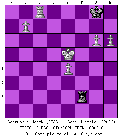 Last move : 1-0 2014 July 9 20:12:42 [Event "FICGS__CHESS__STANDARD_OPEN__000006"] [Site "FICGS"] [Date "2013.07.12"] [Round "2"] [White "Soszynski,Marek"] [Black "Gazi,Miroslav"] [Result "1-0"] [WhiteElo "2236"] [BlackElo "2086"] 1.d4 Nf6 2.c4 e6 3.Nc3 Bb4 4.Qc2 O-O 5.a3 Bxc3+ 6.Qxc3 b6 7.Bg5 Bb7 8.e3 d6 9.Ne2 Nbd7 10.Qc2 c5 11.Rd1 cxd4 12.Nxd4 Ba6 13.f3 Rc8 14.Qa4 Nc5 15.Qb4 d5 16.cxd5 Bxf1 17.Rxf1 Qxd5 18.Bxf6 gxf6 19.Kf2 Rfd8 20.Kg1 Kh8 21.h3 Qg5 22.Qe1 a6 23.e4 Rg8 24.Qf2 b5 25.Rd2 Nb7 26.Rd3 Qh6 27.Kh1 Rgd8 28.Re1 Na5 29.f4 Nc4 30.Rc3 Rg8 31.Kh2 Rcd8 32.b3 Nxa3 33.Nc6 Rd7 34.R1e3 b4 35.Nxb4 Nb5 36.Rcd3 Nd6 37.Qf3 e5 38.f5 Ra8 39.Qf2 Rc8 40.Nd5 Rb8 41.b4 R7d8 42.Qe2 Nb5 43.Rg3 Ra8 44.Qc2 Rdc8 45.Qa2 Rd8 46.Rg4 Nd4 47.Rdg3 Rf8 48.Qc4 Rad8 49.Qxa6 Nxf5 50.Rf3 Nh4 51.Rxf6 Ng6 52.Qf1 Qd2 53.Rxf7 Rxf7 54.Qxf7 Rf8 55.Qe6 Qf2 56.Qd6 Qf1 57.h4 Ra8 58.Ne7 Qf7 59.Nxg6+ hxg6 60.Rxg6 Qf4+ 61.g3 Ra2+ 62.Kh3 Qf1+ 63.Kg4 Qe2+ 64.Kg5 Qd2+ 65.Qxd2 Rxd2 66.b5 Rd3 67.g4 Rd4 68.Kf5 Rd7 69.b6 Kh7 70.Rc6 Rf7+ 71.Kg5 Rf2 72.b7 Rb2 73.Rc7+ Kg8 74.h5 Rb5 75.h6 Rb4 76.Kf5 Rb5 77.g5 Rb3 78.g6 Rf3+ 79.Kxe5 Rf2 80.Rc8+ 1-0 Nimzo-Indian : Classical variation Kingside Castling by player Black (move 4) 10 pieces endgame at move 65 : White KQRPPPP , Black KRP WHITE : King + 1 Queen 1 Rook 4 Pawns BLACK : King + 1 Rook 1 Pawn 9 pieces endgame at move 65 : White KRPPPP , Black KRP WHITE : King + 1 Rook 4 Pawns BLACK : King + 1 Rook 1 Pawn 8 pieces endgame at move 79 : White KRPPPP , Black KR WHITE : King + 1 Rook 4 Pawns BLACK : King + 1 Rook Player White won this chess game. Follow this game move after move (download)If one piece is badly posted, the whole game is bad. (Tarrasch) Bis zum Jahr 1971 verlief in meiner Schachkariere alles glatt. Dieses dramatische Match [Fischer-Taimanov 6:0] machte mein Leben zur Hölle. (Mark Taimanov) El juego del Ajedrez no es solamente una diversión quieta; algunas cualidades muy valuables de la mente se pueden adquirir y cultivar con el, como convertirlos en habitos disponibles para toda ocasión; ya que la vida es algo así como el Ajedrez. (Benjamin Franklin) Je fais ceci parce que dans cinquante coups j'obtiendrai cela; je m'appelle Mikhail Moisevitch Botvinnik. (Botvinnik) Creativity is allowing yourself to make mistakes. Art is knowing which ones to keep. (Scott Adams)
