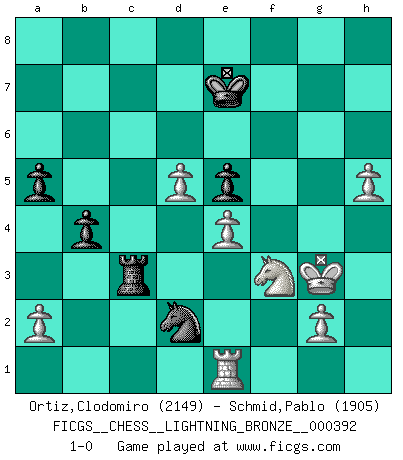 Last move : 1-0 2013 July 13 1:4:39 [Event "FICGS__CHESS__LIGHTNING_BRONZE__000392"] [Site "FICGS"] [Date "2013.07.13"] [Round "1"] [White "Ortiz,Clodomiro"] [Black "Schmid,Pablo"] [Result "1-0"] [WhiteElo "2149"] [BlackElo "1905"] 1.d4 Nf6 2.c4 g6 3.Nc3 d5 4.cxd5 Nxd5 5.e4 Nxc3 6.bxc3 c5 7.Bc4 Bg7 8.Ne2 O-O 9.Be3 Nc6 10.O-O Bg4 11.f3 Na5 12.Bxf7+ Rxf7 13.fxg4 Rxf1+ 14.Kxf1 cxd4 15.cxd4 e5 16.Kg1 Rc8 17.d5 Nc4 18.Qb3 a6 19.h3 b5 20.Kh2 Qa5 21.Rf1 Rf8 22.Rc1 Rf7 23.Ng1 Bf8 24.Nf3 Qa3 25.Qxa3 Bxa3 26.Re1 Rc7 27.Bh6 Bf8 28.Bxf8 Kxf8 29.Ng5 Ke7 30.Nxh7 Nd2 31.Ng5 Rc2 32.h4 b4 33.Kg3 Rc3+ 34.Nf3 a5 35.h5 gxh5 36.gxh5 1-0 King's Indian defense, 3.Nc3 Kingside Castling by player Black (move 8) Kingside Castling by player White (move 10) Player White won this chess game. Follow this game move after move (download)Chess is everything: art, science and sport. (Anatoly Karpov) Darum geht es im Schach. Einen Tag gibst du deinem Gegner eine Lektion, am nächsten Tag gibt er dir eine. (Robert James Fischer) Un Peón pasado es un criminal, quién debe ser mantenido bajo candado y llave. Leves medidas, tales como vigilancia policiaca, no son suficientes. (Aaron Nimzovich) Nous sommes les pions de la mystérieuse partie d'Echecs jouée par Dieu. Il nous déplace, nous arrête, nous pousse encore, puis nous lance un à un dans la boîte du Néant. Epitaphe sur la tombe de David Janowsky (1868-1927). Hardware: the parts of a computer that can be kicked. (Jeff Persis)