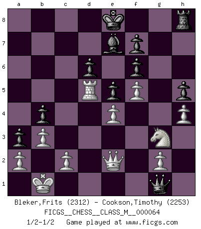 Last move : 1/2-1/2 2014 January 12 20:22:6 [Event "FICGS__CHESS__CLASS_M__000064"] [Site "FICGS"] [Date "2013.07.13"] [Round "1"] [White "Bleker,Frits"] [Black "Cookson,Timothy"] [Result "1/2-1/2"] [WhiteElo "2312"] [BlackElo "2253"] 1.e4 c5 2.Nf3 Nc6 3.d4 cxd4 4.Nxd4 Nf6 5.Nc3 d6 6.Bg5 a6 7.Qd2 e6 8.O-O-O Bd7 9.f4 h6 10.Bh4 b5 11.Bxf6 gxf6 12.Kb1 h5 13.h4 Qb6 14.Nce2 Rc8 15.Rh3 b4 16.Rd3 a5 17.Ng3 Nxd4 18.Rxd4 Rc3 19.Qe1 Be7 20.f5 e5 21.Rd5 Rc7 22.b3 Rc3 23.R5d3 Rxd3 24.Rxd3 a4 25.Be2 Bb5 26.Rd2 Bxe2 27.Qxe2 a3 28.Rd5 Qg1+ 1/2-1/2 Sicilian defense Queenside Castling by player White (move 8) This chess game ended in a draw. Follow this game move after move (download)In Chess, just as in life, today's bliss may be tomorrow's poison. (Assaic) Ich las kürzlich ein Buch von Nietzsche. Er sagte Religion verdumme nur die Menschen. Ich stimme zu. (Robert James Fischer) Combinaciones deslumbrantes son para la mayoría, mover madera es para los pocos. (Georg Kieninger) On n'a jamais que l'âge auquel on a commence à jouer aux échecs car après on cesse de vieillir. (Capablanca) In my experience, there's no such thing as luck. (Obi-Wan Kenobi in Star Wars ep.4)
