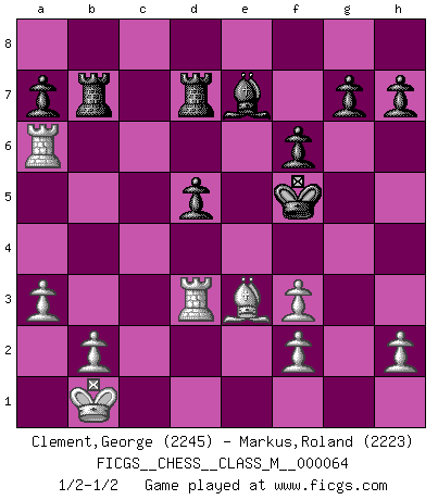 Last move : 1/2-1/2 2013 November 20 19:31:30 [Event "FICGS__CHESS__CLASS_M__000064"] [Site "FICGS"] [Date "2013.07.13"] [Round "1"] [White "Clement,George"] [Black "Markus,Roland"] [Result "1/2-1/2"] [WhiteElo "2245"] [BlackElo "2223"] 1.e4 c6 2.c4 d5 3.exd5 cxd5 4.d4 Nf6 5.Nc3 Nc6 6.Nf3 Bg4 7.cxd5 Nxd5 8.Qb3 Bxf3 9.gxf3 e6 10.Qxb7 Nxd4 11.Bb5+ Nxb5 12.Qc6+ Ke7 13.Qxb5 Qd7 14.Nxd5+ Qxd5 15.Qxd5 exd5 16.Be3 Ke6 17.O-O-O Bb4 18.Kb1 Rhd8 19.Rd3 Rd7 20.Rc1 Rb8 21.Rc6+ Kf5 22.Ra6 R8b7 23.Bd4 Bf8 24.a3 f6 25.Be3 Be7 1/2-1/2 Caro-Kann : Anti-anti-Caro-Kann defense Queenside Castling by player White (move 17) This chess game ended in a draw. Follow this game move after move (download)Tactics flow from a superior position. (Bobby Fischer) Im Spitzenschach von heute geht es nur um Vorbereitung, um tiefgründige, sorgfältige Eröffnungsvorbereitung. (Nigel Short) El Ajedrez es parte de una cultura y si una cultura esta en decadencia, entonces también el Ajedrez declinará. (Mikhail Botvinnik) Si rien de grave n'est détecté lors de l'analyse d'une position, on joue alors le coup. Seconde règle de Blumenfeld. Have no fear of perfection - you'll never reach it. (Salvador Dali)