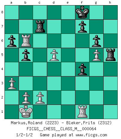 Last move : 1/2-1/2 2013 November 20 12:35:42 [Event "FICGS__CHESS__CLASS_M__000064"] [Site "FICGS"] [Date "2013.07.13"] [Round "1"] [White "Markus,Roland"] [Black "Bleker,Frits"] [Result "1/2-1/2"] [WhiteElo "2223"] [BlackElo "2312"] 1.e4 c5 2.Nf3 d6 3.d4 cxd4 4.Nxd4 Nf6 5.Nc3 a6 6.Be3 e6 7.f3 b5 8.Qd2 Nbd7 9.O-O-O Bb7 10.a3 Rc8 11.g4 Nb6 12.Kb1 Nfd7 13.g5 Ne5 14.f4 Nec4 15.Bxc4 Nxc4 16.Qd3 Be7 17.h4 Qa5 18.Na2 Qb6 19.Rhe1 Nxe3 20.Qxe3 e5 21.Nf5 Qxe3 22.Rxe3 exf4 23.R3e1 g6 24.Nxd6+ Bxd6 25.Rxd6 h6 26.Rb6 hxg5 27.hxg5 Rc7 28.Nc3 Rh5 29.Nd5 Bxd5 30.exd5 Kf8 31.Rf1 1/2-1/2 Sicilian : Najdorf, Byrne (English) attack Queenside Castling by player White (move 9) This chess game ended in a draw. Follow this game move after move (download)I like the moment when I break a man's ego. (Bobby Fischer) Fallen sollten polizeilich verboten werden. (Savielly Grigorievitsch Tartakower) El Ajedrez es un juego de pelea el cual es puramente intelectual e incluye la suerte. (Richard Reti) La vérité est comme le meilleur coup aux échecs : elle existe, mais il faut la chercher. (Arturo Perez-Reverte) Strategy without tactics is the slowest route to victory. Tactics without strategy is the noise before defeat. (Sun Tzu)