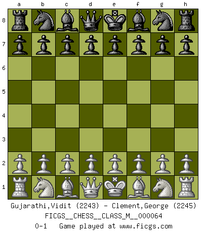 Last move : 0-1 2013 August 23 0:25:1 [Event "FICGS__CHESS__CLASS_M__000064"] [Site "FICGS"] [Date "2013.07.13"] [Round "1"] [White "Gujarathi,Vidit"] [Black "Clement,George"] [Result "0-1"] [WhiteElo "2243"] [BlackElo "2245"] 0-1 This chess game has been lost on time (started : 2013.07.13 20:15:13) Player Black won this chess game. Follow this game move after move (download)I thought the most common mistake [in chess] was the first one: Learning the game :P (Garvin Gray, FICGS forum) Um sich vor der Gefahr einer Erkältung zu schützen, sorge der wanderlustige König beizeiten für ein brauchbares Versteck. (Aaron Nimzowitsch) El Ajedrez es un cuento de Hadas de las 1001 metidas de pata. (Savielly Tartakower) A chaque perte on perd un peu de soi. (Joël Lautier) Establishing goals is all right if you don't let them deprive you of interesting detours. (Doug Larson)