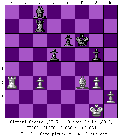 Last move : 1/2-1/2 2014 January 31 23:20:15 [Event "FICGS__CHESS__CLASS_M__000064"] [Site "FICGS"] [Date "2013.07.13"] [Round "1"] [White "Clement,George"] [Black "Bleker,Frits"] [Result "1/2-1/2"] [WhiteElo "2245"] [BlackElo "2312"] 1.e4 c5 2.Nf3 d6 3.d4 cxd4 4.Nxd4 Nf6 5.Nc3 a6 6.Bg5 Nbd7 7.a4 Qc7 8.Be2 e6 9.O-O Be7 10.a5 Nc5 11.Bf3 O-O 12.Re1 Rb8 13.Qd2 Rd8 14.Be3 h6 15.Ra2 b5 16.axb6 Rxb6 17.Nb3 Rb8 18.Na5 Nb7 19.Ba7 Ra8 20.Nxb7 Bxb7 21.Bd4 d5 22.e5 Ne4 23.Qe3 Bg5 24.Qd3 Bd2 25.Rea1 Nxc3 26.bxc3 Bf4 27.Qe2 Bg5 28.g3 Rdc8 29.c4 Qxc4 30.Qxc4 Rxc4 31.c3 Be7 32.Be2 Rc6 33.Rb1 Rc7 34.Bb6 Rd7 35.Bd4 Bc8 36.Rba1 Rc7 37.Ra5 g5 38.f4 Kg7 39.Rf1 Bd8 40.fxg5 hxg5 41.Ra2 a5 42.Bb6 Rd7 43.Bxd8 Rxd8 44.Rfa1 Rd7 45.Rxa5 Rxa5 46.Rxa5 Rc7 47.Ra3 f6 48.exf6+ Kxf6 49.Bf3 1/2-1/2 Sicilian : Najdorf, 6.Bg5 Kingside Castling by player White (move 9) Kingside Castling by player Black (move 11) This chess game ended in a draw. Follow this game move after move (download)Bobby just drops the pieces and they fall on the right squares. (Miguel Najdorf) Frage: Was machen Sie mit den Preisen? Anwort: Ich habe Angst, dass meine Freundin davon neue Kleider kauft. (Loek van Wely) Las leyes del Ajedrez no permiten una libre elección: tienes que mover quieras o no. (Emanuel Lasker) Les Echecs mettent en conflit, non pas deux intelligences, mais deux volontés. (Lasker) All politicians must be presumed guilty until they are proven innocent. (Dinesh De Silva)