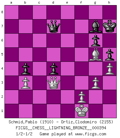 Last move : 1/2-1/2 2013 July 14 3:19:47 [Event "FICGS__CHESS__LIGHTNING_BRONZE__000394"] [Site "FICGS"] [Date "2013.07.14"] [Round "1"] [White "Schmid,Pablo"] [Black "Ortiz,Clodomiro"] [Result "1/2-1/2"] [WhiteElo "1910"] [BlackElo "2155"] 1.d4 Nf6 2.c4 e6 3.Nf3 d5 4.g3 dxc4 5.Bg2 a6 6.O-O Nc6 7.Nc3 Rb8 8.e4 Be7 9.Qe2 Nxd4 10.Nxd4 Qxd4 11.Rd1 Qc5 12.e5 Nd5 13.Nxd5 exd5 14.Bxd5 O-O 15.Bxc4 Qc6 16.Bd3 Be6 17.Bf4 Qb6 18.Qc2 g6 19.Rac1 c5 20.b3 Rfd8 21.Be4 Rbc8 22.Rxd8+ Rxd8 23.h4 Rd7 24.Qc3 Qb5 25.Be3 b6 26.Bf3 a5 27.Qc2 Bd5 28.Bxd5 Rxd5 29.Qe4 Qc6 30.Qf3 h5 31.Bf4 Kg7 32.Kg2 Qe6 33.Rc3 Kh7 34.Rd3 Rd4 35.Rxd4 cxd4 36.Qe4 Qd7 37.Qd3 b5 38.Kf1 Qd5 39.Ke2 a4 40.Qf3 Qe6 41.Qd3 axb3 42.axb3 Qd5 43.Qf3 Qd7 44.Kd3 Bf8 45.Bg5 b4 46.Bf6 Qb5+ 47.Kd2 Bh6+ 48.Bg5 Bg7 49.Qxf7 Qxe5 50.Qf3 Qe6 51.Qd3 Qc6 52.Ke2 Qd5 53.Kf1 Qh1+ 54.Ke2 Qc6 55.Kf1 Qc3 56.Ke2 Qc5 57.Kf1 Qd6 58.Ke2 Qd7 59.Kf1 Qf7 60.Ke2 Bf8 61.Kf1 Qd7 62.Ke2 Qc6 63.Kf1 Qc3 64.Ke2 Qc5 65.Kf1 Qd5 66.Ke2 Qd7 67.Kf1 Bh6 68.Bf6 Bg7 69.Bg5 Bh6 70.Bf6 Bg7 71.Bg5 1/2-1/2 Queen's pawn game Kingside Castling by player White (move 6) Kingside Castling by player Black (move 14) This chess game ended in a draw. Follow this game move after move (download)The stomach is an essential part of the Chess master. (Bent Larsen) Der 70jährige Viktor Kortschnoi: Die Rentenanstalt wollte mich zwingen in Rente zu gehen. Meine Frau erhält jetzt eine Pension- und ich zahle weiter in die Rentenkasse ein! (Viktor Kortschnoi) Ayuda a tus piezas para que ellas te puedan ayudar. (Paul Morphy) Il n'y a pas eu de défaite parce que je ne crois pas que cet ordinateur ait jamais existé. IBM a triché en refusant d'imprimer les modes de recherche de la machine. C'est évident, pendant le match, des coups décisifs ont été joués par des êtres humains. Aujourd'hui, les meilleurs spécialistes en informatique ne peuvent toujours pas expliquer comment Deep-Blue a pu jouer contre la logique des ordinateurs. IBM a gagné une guerre de communication, mais ils sont incapables de prouver que l'ordinateur a gagné tout seul. (Garry Kasparov) The Movers & Shakers of this world are those who play chess in the mornings and go to the disco in the evenings. (Dinesh De Silva)
