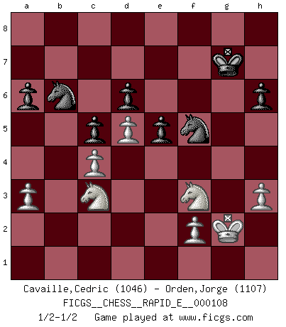 Last move : 1/2-1/2 2013 August 8 14:25:48 [Event "FICGS__CHESS__RAPID_E__000108"] [Site "FICGS"] [Date "2013.07.14"] [Round "1"] [White "Cavaille,Cedric"] [Black "Orden,Jorge"] [Result "1/2-1/2"] [WhiteElo "1046"] [BlackElo "1107"] 1.e4 c5 2.c4 g6 3.Nf3 Bg7 4.d4 b6 5.d5 Bb7 6.Bd3 d6 7.O-O Nd7 8.Qc2 e6 9.Nc3 Ne7 10.a3 O-O 11.Bf4 e5 12.Be3 a6 13.b4 Rb8 14.bxc5 bxc5 15.Qd2 Ba8 16.Rfb1 Qc7 17.Bh6 Kh8 18.Rxb8 Qxb8 19.Bxg7+ Kxg7 20.Qe3 Ng8 21.Ng5 Qb2 22.Qc1 Qb7 23.Qb1 Rb8 24.Qxb7 Rxb7 25.Rb1 Rxb1+ 26.Nxb1 h6 27.Nf3 Nb6 28.Nc3 Bb7 29.g4 Bc8 30.h3 Ne7 31.Kg2 f5 32.exf5 gxf5 33.gxf5 Bxf5 34.Bxf5 Nxf5 1/2-1/2 Sicilian defense Kingside Castling by player White (move 7) Kingside Castling by player Black (move 10) This chess game ended in a draw. Follow this game move after move (download)Robert Fischer is a law unto himself. (Larry Evans) Je älter ich werde, um so mehr schätze ich die Bauern. (Paul Keres) Nunca nadie ha ganado una partida de Ajedrez rindiendose. (Unknown) Si je n'étais pas joueur d'échecs, je serais le meilleur dans quelque chose d'autre. (Anatoli Karpov) Art is the only way to run away without leaving home. (Twyla Tharp)