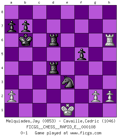 Last move : 0-1 2013 July 30 22:20:31 [Event "FICGS__CHESS__RAPID_E__000108"] [Site "FICGS"] [Date "2013.07.14"] [Round "1"] [White "Melquiades,Jay"] [Black "Cavaille,Cedric"] [Result "0-1"] [WhiteElo "0853"] [BlackElo "1046"] 1.e4 e5 2.Nf3 Nf6 3.Nxe5 Nxe4 4.Qf3 Nf6 5.Nc3 d5 6.d4 Bb4 7.Bg5 Bxc3+ 8.bxc3 Qe7 9.O-O-O Bg4 10.Bxf6 Bxf3 11.Bxe7 Bxd1 12.Kxd1 Kxe7 13.Bd3 f6 14.Ng4 Nc6 15.Re1+ Kd6 16.c4 Nxd4 17.c3 Nc6 18.Bf5 g6 19.Re6+ Kc5 20.Bd3 dxc4 21.Bxc4 Kxc4 22.Ne3+ Kxc3 23.Nd5+ Kc4 24.Ne3+ Kc5 25.Rxf6 Rad8+ 26.Ke1 Rd4 27.Nc2 Re8+ 28.Ne3 Red8 29.f4 Nb4 30.f5 Nd5 31.Rf7 Nxe3 32.Rxc7+ Kb6 33.Rxh7 gxf5 34.Rh6+ R8d6 0-1 Petrov : Damiano variation Queenside Castling by player White (move 9) Player Black won this chess game. Follow this game move after move (download)One bad move nullifies forty good ones. (Horowitz) Frage des Reporters: -Worin besteht das Ziel von Gambiteröffnungen? Antwort: -Auf Kosten der Partie einen Ruf als Angriffspieler zu erwerben.- (Siegbert Tarrasch) Tu eres para mi la Reina en d8 y yo soy el Peón en d7!!. (GM Eduard Gufeld) Les échecs sont utiles à l'exercice de la faculté de penser et à celle de l'imagination. Car nous devons posséder une méthode élaborée pour atteindre des buts partout où nous devons conduire notre raison. (Leibnitz) Always be a first-rate version of yourself, instead of a second-rate version of somebody else. (Judy Garland)