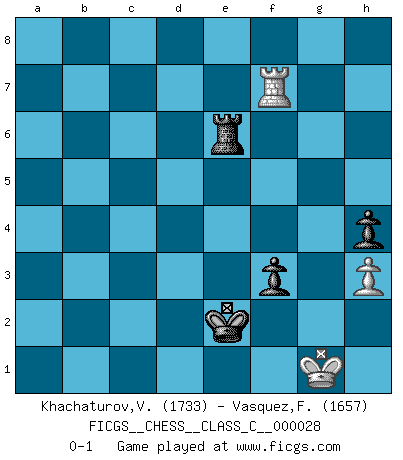 Last move : 0-1 2008 January 20 17:47:5 [Event "FICGS__CHESS__CLASS_C__000028"] [Site "FICGS"] [Date "2007.02.04"] [Round "1"] [White "Khachaturov,Vadim"] [Black "Vasquez,Fernando"] [Result "0-1"] [WhiteElo "1733"] [BlackElo "1657"] 1.e4 e5 2.Nf3 Nf6 3.Nxe5 d6 4.Nf3 Nxe4 5.d4 d5 6.Bd3 Bd6 7.O-O O-O 8.c4 c6 9.cxd5 cxd5 10.Nc3 Nxc3 11.bxc3 Qc7 12.Qc2 h6 13.Rb1 Be6 14.c4 b6 15.Re1 Nd7 16.Bf5 Bxf5 17.Qxf5 Rfe8 18.Rxe8+ Rxe8 19.Qxd5 Nf6 20.Qb5 Rc8 21.Ne5 Ne4 22.Bb2 Bxe5 23.dxe5 Qxc4 24.Qxc4 Rxc4 25.f3 Nc5 26.Ba3 Nd3 27.Bd6 Rc2 28.a3 Nf4 29.e6 Nxe6 30.Bb8 Ra2 31.Bxa7 Nf4 32.Bxb6 Rxg2+ 33.Kh1 Ra2 34.Bc5 Ne6 35.Bd6 Nd4 36.f4 f6 37.Rd1 Nf5 38.Bc5 Kf7 39.Rf1 Ke6 40.Rf2 Ra1+ 41.Kg2 Kd5 42.Bb4 Ke4 43.h3 h5 44.Kh2 Nd4 45.Kg2 Ne6 46.Bd6 Kf5 47.Rb2 Nxf4+ 48.Bxf4 Kxf4 49.Rb4+ Kf5 50.Rb5+ Kg6 51.Rb3 h4 52.Rb4 Kh5 53.a4 g5 54.Rb6 Ra2+ 55.Kg1 Kg6 56.Rb4 f5 57.Rb6+ Kg7 58.Rb5 Kf6 59.Rb6+ Ke5 60.Rb5+ Ke4 61.Rb4+ Kf3 62.Rb3+ Ke2 63.Rb5 f4 64.Re5+ Kf3 65.Rxg5 Ra1+ 66.Kh2 Rxa4 67.Rg8 Ke3 68.Kg1 Ra1+ 69.Kh2 Ra2+ 70.Kg1 Ra3 71.Rf8 Kf3 72.Rg8 Ke2 73.Re8+ Re3 74.Rf8 f3 75.Rf7 Re6 0-1 Petrov : Classical attack, Marshall variation Kingside Castling by player White (move 7) Kingside Castling by player Black (move 7) 10 pieces endgame at move 48 : White KRBPP , Black KRPPP WHITE : King + 1 Rook 1 Bishop 2 Pawns BLACK : King + 1 Rook 3 Pawns 9 pieces endgame at move 48 : White KRPP , Black KRPPP WHITE : King + 1 Rook 2 Pawns BLACK : King + 1 Rook 3 Pawns 8 pieces endgame at move 65 : White KRPP , Black KRPP WHITE : King + 1 Rook 2 Pawns BLACK : King + 1 Rook 2 Pawns 7 pieces endgame at move 66 : White KRP , Black KRPP WHITE : King + 1 Rook 1 Pawn BLACK : King + 1 Rook 2 Pawns Player Black won this chess game. Follow this game move after move (download)He who takes the Queen's Knight's Pawn will sleep in the streets. (Anonymous) Im Fernschach kannst du während dem Spiel rauchen. (John Christen Knudsen) Aquel que teme a un Peón de Reina aislado, debería de retirarse del Ajedrez. (Siegbert Tarrasch) Il n'y a plus de joueurs du niveau de Jacob Murray dont la seule quête est le beau jeu, le plaisir de voir les pièces construire quelque chose. Sur 10 idées à la minute, 9 seront sans intérêt, la dernière s'avèrera géniale. (Christian Bauer) A specialist learns more and more about less and less until he knows everything about nothing. (Nicholas Murray Butler)