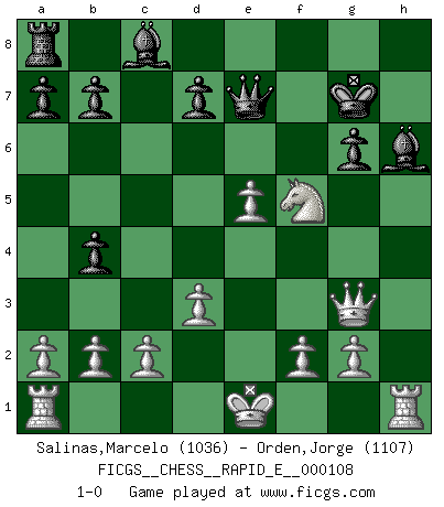 Last move : 1-0 2013 August 29 10:51:24 [Event "FICGS__CHESS__RAPID_E__000108"] [Site "FICGS"] [Date "2013.07.14"] [Round "1"] [White "Salinas,Marcelo"] [Black "Orden,Jorge"] [Result "1-0"] [WhiteElo "1036"] [BlackElo "1107"] 1.e4 c5 2.Bc4 Nc6 3.Qh5 e6 4.Nf3 Nf6 5.Qh4 h6 6.e5 Nd5 7.Bxd5 exd5 8.Nc3 Be7 9.Qg3 O-O 10.d3 d4 11.Bxh6 g6 12.Bxf8 Bxf8 13.Nd5 Nb4 14.Nxb4 cxb4 15.h4 Bh6 16.Nxd4 Qe7 17.h5 Kg7 18.hxg6 fxg6 19.Nf5+ 1-0 Sicilian defense Kingside Castling by player Black (move 9) Player White won this chess game. Follow this game move after move (download)Fischer is the strongest player in the world. In fact, the strongest player who ever lived. (Larry Evans) Alles was am Schachbrett zählt sind gute Züge. (Robert James Fischer) Es muy difícil jugar en contra de la teoría de Einstein. - en su primera derrota en contra de Fischer (Mikhail Tal) C'est la seule position que je connaisse où les deux camps sont mals. Propos prêtés à V. Anand. He who laughs last probably does not get the joke. (Unknown)
