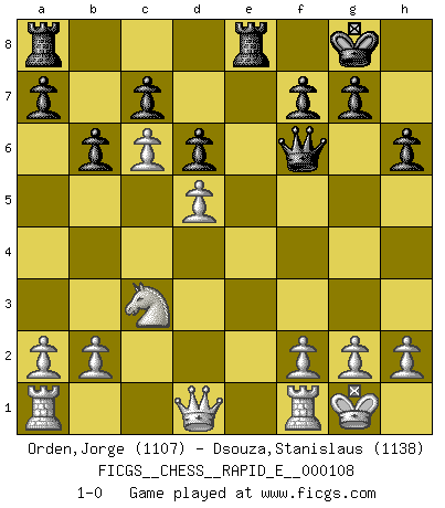 Last move : 1-0 2013 September 5 13:23:24 [Event "FICGS__CHESS__RAPID_E__000108"] [Site "FICGS"] [Date "2013.07.14"] [Round "1"] [White "Orden,Jorge"] [Black "Dsouza,Stanislaus"] [Result "1-0"] [WhiteElo "1107"] [BlackElo "1138"] 1.e4 e5 2.Nf3 d6 3.c3 Be6 4.Be2 Nc6 5.d4 exd4 6.cxd4 Nf6 7.Bg5 Be7 8.O-O O-O 9.d5 Bg4 10.dxc6 b6 11.Nc3 h6 12.Be3 Re8 13.Nd5 Nxd5 14.exd5 Bf6 15.Bd4 Bxd4 16.Nxd4 Bxe2 17.Nxe2 Qf6 18.Nc3 1-0 This chess game has been lost on time (started : 2013.07.14 2:51:26) Philidor's defense Kingside Castling by player White (move 8) Kingside Castling by player Black (move 8) Player White won this chess game. Follow this game move after move (download)One bad move nullifies forty good ones. (Horowitz) Wer der Ansicht ist, daß alle Schachspieler verrückt sind, wird durch Studium des Lebens von Emil Josef Diemer nicht auf andere Gedanken kommen. (Hans Ree) Un buen sacrificio es aquel que aunque no sea necesariamente sólido, deja a tu oponente aturdido y confuso. (Rudolph Spielmann) La tactique, c'est ce que vous faites quand il y a quelque chose à faire; la stratégie, c'est ce que vous faites quand il n'y a rien à faire. (Savielli Tartacower) Winning isn't everything... but losing is nothing. (Mednis)