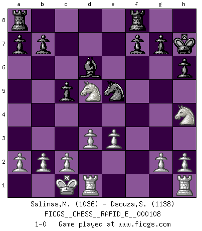 Last move : 1-0 2013 September 25 14:58:0 [Event "FICGS__CHESS__RAPID_E__000108"] [Site "FICGS"] [Date "2013.07.14"] [Round "1"] [White "Salinas,Marcelo"] [Black "Dsouza,Stanislaus"] [Result "1-0"] [WhiteElo "1036"] [BlackElo "1138"] 1.e3 d5 2.Nc3 e6 3.Bb5+ c6 4.Bd3 Bd6 5.Qg4 Qf6 6.e4 Nh6 7.Qf3 Qxf3 8.Nxf3 Ng4 9.exd5 c5 10.Bb5+ Bd7 11.Bxd7+ Nxd7 12.d3 exd5 13.Nxd5 O-O 14.Bg5 h6 15.Be3 Nxe3 16.fxe3 Kh7 17.O-O-O Ne5 18.Nh4 1-0 This chess game has been lost on time (started : 2013.07.14 2:51:26) Van't Kruijs Opening Kingside Castling by player Black (move 13) Queenside Castling by player White (move 17) Player White won this chess game. Follow this game move after move (download)After black's reply to 1.e4 with 1..e5, leaves him always trying to get into the game. (Howard Staunton) Jeder Schachmeister war einmal ein Anfänger. (Irving Chernev) Un buen jugador siempre tiene buena suerte. (José Raúl Capablanca) J'ai vu le vaincu d'Echecs jouer des années durant dans l'espoir de la fête de la victoire. Car tu es plus riche de ce qu'elle existe si même elle n'est point pour toi. Ainsi de la perle du fond des mers. (Antoine de Saint-Exupéry) There is a computer disease that anybody who works with computers knows about. It's a very serious disease and it interferes completely with the work. The trouble with computers is that you 'play' with them ! (Richard P. Feynman)