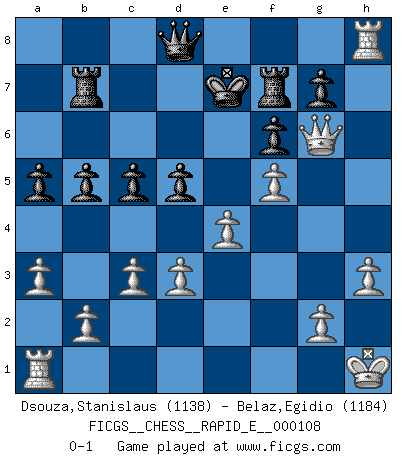 Last move : 0-1 2013 September 23 2:36:59 [Event "FICGS__CHESS__RAPID_E__000108"] [Site "FICGS"] [Date "2013.07.14"] [Round "1"] [White "Dsouza,Stanislaus"] [Black "Belaz,Egidio"] [Result "0-1"] [WhiteElo "1138"] [BlackElo "1184"] 1.e4 Nf6 2.f3 e5 3.Bc4 Be7 4.d3 O-O 5.Ne2 Nc6 6.Nbc3 Bb4 7.a3 Bd6 8.Bd2 a6 9.O-O Bc5+ 10.Kh1 d6 11.Ng3 b5 12.Ba2 Nd4 13.Nce2 a5 14.Nxd4 Bxd4 15.c3 Bc5 16.f4 Bb7 17.f5 Ba6 18.Qc2 Ng4 19.h3 Ne3 20.Bxe3 Bxe3 21.Bd5 Rb8 22.Qe2 Bf4 23.Nh5 Bb7 24.Bxb7 Rxb7 25.Nxf4 exf4 26.Rxf4 f6 27.Qh5 c5 28.Rh4 h6 29.Qg4 d5 30.Rxh6 R8f7 31.Qg6 Kf8 32.Rh8+ Ke7 0-1 This chess game has been lost on time (started : 2013.07.14 2:51:26) Alekhine's defense Kingside Castling by player Black (move 4) Kingside Castling by player White (move 9) Player Black won this chess game. Follow this game move after move (download)The hardest game to win is a won game. (Emanuel Lasker) Ich organisiere ein großes Turnier, was mich etwa 120000 Dollar kostet. Ich denke, das ist das erste Mal in der Schachgeschichte, daß ein Schachgroßmeister auch als Mäzen auftritt. (Miguel Najdorf) El tablero es el mundo, las piezas es el fenomeno del universo, las reglas del juego son lo que llamamos leyes de la naturaleza y el jugador del lado opuesto, se encuentra oculto a nuestra vista. (Thomas Huxley) Même si vous avez un bon coup à faire, regardez toujours s'il n'y en a pas un qui lui soit préférable. (Pedro Damiano) All the biggest technological inventions created by man - the airplane, the automobile, the computer - says little about his intelligence, but speaks volumes about his laziness. (Mark Kennedy)