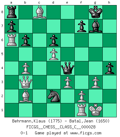 Last move : 0-1 2007 March 12 0:11:8 [Event "FICGS__CHESS__CLASS_C__000028"] [Site "FICGS"] [Date "2007.02.04"] [Round "1"] [White "Behrmann,Klaus"] [Black "Batal,Jean"] [Result "0-1"] [WhiteElo "1775"] [BlackElo "1650"] 1.b3 Nf6 2.Bb2 g6 3.Nf3 Bg7 4.e3 O-O 5.Be2 d6 6.O-O e5 7.d4 e4 8.Nfd2 Re8 9.c4 Bf5 10.Nc3 c5 11.d5 Nbd7 12.a3 Ne5 13.h3 h5 14.b4 b6 15.Qb3 Qe7 16.Rab1 cxb4 17.axb4 Rec8 18.Ra1 g5 19.Ra6 g4 20.hxg4 Nfxg4 21.g3 h4 22.Ncxe4 Bxe4 23.Nxe4 Nxc4 24.Bxg4 Qxe4 25.Bxc8 Nd2 0-1 Nimzovich-Larsen attack : Indian variation Kingside Castling by player Black (move 4) Kingside Castling by player White (move 6) Player Black won this chess game. Follow this game move after move (download)In life, as in Chess, one's own Pawns block one's way. A man's very wealth, ease, leisure, children, books, which should help him to win, more often checkmate him. (Charles Buxton) Fallen sollten polizeilich verboten werden. (Savielly Grigorievitsch Tartakower) Las Aperturas te enseñan aperturas. ¡Los Finales te enseñan Ajedrez!. (Stephan Gerzadowicz) Je menace de comprendre la position. (Anonyme) You have to believe in yourself. (Sun Tzu)