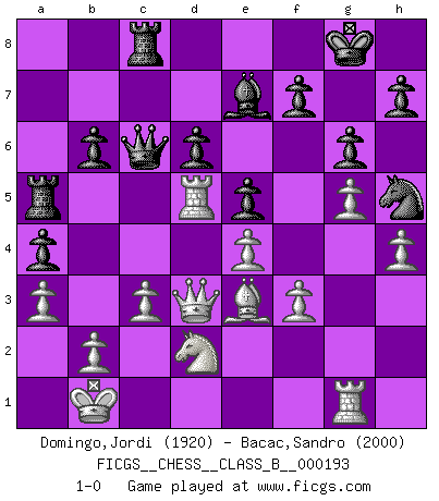 Last move : 1-0 2013 November 2 17:46:5 [Event "FICGS__CHESS__CLASS_B__000193"] [Site "FICGS"] [Date "2013.07.14"] [Round "1"] [White "Domingo,Jordi"] [Black "Bacac,Sandro"] [Result "1-0"] [WhiteElo "1920"] [BlackElo "2000"] 1.e4 c5 2.Nf3 d6 3.d4 cxd4 4.Nxd4 Nf6 5.Nc3 a6 6.Be3 e5 7.Nb3 Be6 8.f3 Be7 9.Qd2 O-O 10.O-O-O Qc7 11.g4 Nbd7 12.g5 Nh5 13.Kb1 Nb6 14.Qf2 Nc4 15.Bxc4 Qxc4 16.Rhg1 a5 17.Nd5 Bxd5 18.Rxd5 a4 19.Nd2 Qc6 20.a3 b6 21.Qe2 Rfc8 22.Qd3 Ra5 23.h4 g6 24.c3 1-0 Sicilian : Najdorf, Byrne (English) attack Kingside Castling by player Black (move 9) Queenside Castling by player White (move 10) Player White won this chess game. Follow this game move after move (download)Chess, like love, like music, has the power to make people happy. (Siegbert Tarrasch) Wenn ich Weiß habe gewinne ich weil ich Weiß habe, wenn ich Schwarz habe gewinne ich weil ich Bogoljubov bin. (Efim Bogoljubov) Yo no le temo a Spassky. Todos saben que yo soy el mejor. Uno no necesita un torneo para probarlo. (Bobby Fischer) J'ai toujours senti une vague pitié pour l'homme qui ne connaît rien aux échecs, tout comme j'en aurais pour un homme ignorant de l'amour. Les Echecs, comme la musique ou comme l'amour, ont le pouvoir de rendre heureux. (Siegbert Tarrasch) Memory is a way of holding onto the things you love, the things you are, the things you never want to lose. (from the television show: The Wonder Years)