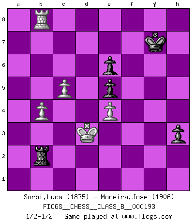 Last move : 1/2-1/2 2013 October 26 23:25:31 [Event "FICGS__CHESS__CLASS_B__000193"] [Site "FICGS"] [Date "2013.07.14"] [Round "1"] [White "Sorbi,Luca"] [Black "Moreira,Jose"] [Result "1/2-1/2"] [WhiteElo "1875"] [BlackElo "1906"] 1.d4 Nf6 2.c4 g6 3.Nc3 Bg7 4.e4 d6 5.Nf3 O-O 6.Be2 Bg4 7.Be3 Nfd7 8.Ng1 Bxe2 9.Ngxe2 c5 10.O-O cxd4 11.Nxd4 Nc6 12.Rc1 Rc8 13.b3 Qa5 14.Qd2 Nc5 15.Rfd1 Rfe8 16.f3 Be5 17.Rb1 Nxd4 18.Bxd4 Ne6 19.Bxe5 dxe5 20.Nd5 Qxd2 21.Rxd2 f6 22.Rbd1 Kf7 23.Kf2 Red8 24.Nc3 Rd4 25.Ke3 a6 26.Nd5 g5 27.Rxd4 Nxd4 28.Rh1 Rd8 29.h4 e6 30.Nb4 a5 31.Nd3 gxh4 32.Rxh4 Nc2+ 33.Ke2 Nd4+ 34.Kd2 Kg6 35.Rh1 h5 36.Rc1 h4 37.Ke3 Kh5 38.Nc5 Rg8 39.Kf2 Rg7 40.Nd3 Kg5 41.Rd1 Rc7 42.Ke3 Nc2+ 43.Kd2 Nd4 44.c5 Rc8 45.Rc1 Nc6 46.Ke3 f5 47.Re1 Nb4 48.Nxb4 axb4 49.Rc1 Ra8 50.Rc2 Ra5 51.Rc4 Rxa2 52.Rxb4 Rxg2 53.Rxb7 Rb2 54.Kd3 h3 55.b4 fxe4+ 56.fxe4 Kg6 57.Rb8 Kg7 58.Rb7+ Kg6 59.Rb8 Kg7 60.Rb7+ Kh6 61.Rb8 Kg7 1/2-1/2 King's Indian : 6.Be2 Kingside Castling by player Black (move 5) Kingside Castling by player White (move 10) 10 pieces endgame at move 56 : White KRPPP , Black KRPPP WHITE : King + 1 Rook 3 Pawns BLACK : King + 1 Rook 3 Pawns This chess game ended in a draw. Follow this game move after move (download)As one by one I mowed them down, my superiority soon became apparent. (Jose Capablanca) Frage des Reporters: -Worin besteht das Ziel von Gambiteröffnungen? Antwort: -Auf Kosten der Partie einen Ruf als Angriffspieler zu erwerben.- (Siegbert Tarrasch) Al jugar al Ajedrez entonces, podemos aprender: Primero: Previsión... Segundo: Prudencia... Tercero: Cautela... Y al final, aprendemos del Ajedrez el hábito de no ser desanimados por apariencias malas presentes en el estado de nuestros asuntos, el hábito de la esperanza por una oportunidad favorable y la perseveración de los secretos de los recursos. (Benjamin Franklin) On n'a jamais que l'âge auquel on a commence à jouer aux échecs car après on cesse de vieillir. (Capablanca) You can think I'm wrong, but that's no reason to quit thinking. (Gregory House, House M.D.)