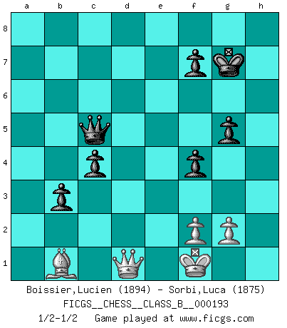 Last move : 1/2-1/2 2013 November 26 14:32:49 [Event "FICGS__CHESS__CLASS_B__000193"] [Site "FICGS"] [Date "2013.07.14"] [Round "1"] [White "Boissier,Lucien"] [Black "Sorbi,Luca"] [Result "1/2-1/2"] [WhiteElo "1894"] [BlackElo "1875"] 1.d4 Nf6 2.Nf3 g6 3.Bg5 Bg7 4.Nbd2 O-O 5.c3 d6 6.e4 c5 7.dxc5 dxc5 8.Bc4 Nc6 9.O-O Qc7 10.Qe2 h6 11.Bh4 Nh5 12.Rfe1 Na5 13.Bb5 a6 14.Ba4 b5 15.Bc2 e5 16.a4 Nf4 17.Qe3 Be6 18.axb5 axb5 19.h3 Nh5 20.Nh2 g5 21.Bg3 Rfd8 22.Red1 Nb7 23.Nhf1 Nf4 24.Nf3 Rxa1 25.Rxa1 b4 26.Qe1 Nd6 27.Ne3 b3 28.Bb1 Qb7 29.Qd1 c4 30.h4 Bf6 31.Nd5 Bxd5 32.exd5 Ra8 33.Rxa8+ Qxa8 34.hxg5 hxg5 35.Bxf4 exf4 36.Nd2 Qxd5 37.Qe2 Kf8 38.Be4 Qa5 39.Qd1 Kg7 40.Bf3 Bxc3 41.bxc3 Qxc3 42.Ne4 Nxe4 43.Bxe4 Qe5 44.Bb1 Qc5 45.Kf1 1/2-1/2 King's Indian : Torre attack Kingside Castling by player Black (move 4) Kingside Castling by player White (move 9) This chess game ended in a draw. Follow this game move after move (download)It's always better to sacrifice your opponent's men. (Savielly Tartakover) Wer wird heute Abend ihr Gegner sein? -- Heute Abend spiele ich gegen die schwarzen Steine. (Akiba Rubinstein) En el Ajedrez, tal como en la vida, las bendiciones de hoy pueden ser el veneno del mañana. (Assaic) Il n'y a plus de joueurs du niveau de Jacob Murray dont la seule quête est le beau jeu, le plaisir de voir les pièces construire quelque chose. Sur 10 idées à la minute, 9 seront sans intérêt, la dernière s'avèrera géniale. (Christian Bauer) Hold em is to stud what chess is to checkers. (Johnny Moss)