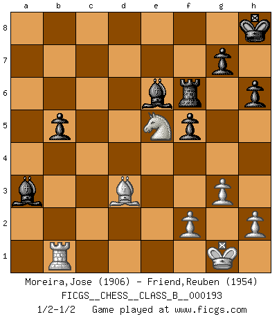Last move : 1/2-1/2 2013 September 10 12:41:5 [Event "FICGS__CHESS__CLASS_B__000193"] [Site "FICGS"] [Date "2013.07.14"] [Round "1"] [White "Moreira,Jose"] [Black "Friend,Reuben"] [Result "1/2-1/2"] [WhiteElo "1906"] [BlackElo "1954"] 1.e4 e6 2.d4 d5 3.Nc3 Nc6 4.Nf3 Nf6 5.Bd3 Bb4 6.Bg5 dxe4 7.Bxe4 h6 8.Bxf6 Qxf6 9.O-O O-O 10.Qd3 Bd7 11.a3 Bd6 12.Rfe1 a6 13.Rad1 Rae8 14.b4 b5 15.g3 Kh8 16.Ne2 e5 17.c4 exd4 18.cxb5 axb5 19.Nexd4 Nxd4 20.Qxd4 Qd8 21.Nh4 Re5 22.Nf3 Re7 23.Qc3 f5 24.Bb1 Rxe1+ 25.Rxe1 Qf6 26.Qxf6 Rxf6 27.Ne5 Be6 28.Bd3 c5 29.bxc5 Bxc5 30.Rb1 Bxa3 1/2-1/2 French : Paulsen variation Kingside Castling by player White (move 9) Kingside Castling by player Black (move 9) This chess game ended in a draw. Follow this game move after move (download)When I asked Fischer why he had not played a certain move in our game, he replied: 'Well, you laughed when I wrote it down !' (Mikhail Tal) Wer sich die Fähigkeit anerziehen will im Schach selbstständig zu denken, der muß alles meiden, was leblos ist: ausgeklügelte Theorien, die sich auf sehr wenige Beispiele und eine Menge Hirngespinste stützen. (Emanuel Lasker) No es tiempo de jugar al Ajedrez cuando la casa esta en llamas. (Proverbio Italiano) La menace est plus forte que l'exécution. (Aaron Nimzovitch) Unless in communicating with it one says exactly what one means, trouble is bound to result. (Alan Turing, about computers)