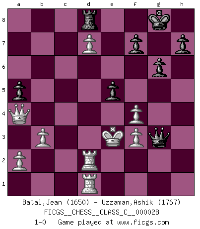 Last move : 1-0 2007 February 14 7:45:53 [Event "FICGS__CHESS__CLASS_C__000028"] [Site "FICGS"] [Date "2007.02.04"] [Round "1"] [White "Batal,Jean"] [Black "Uzzaman,Ashik"] [Result "1-0"] [WhiteElo "1650"] [BlackElo "1767"] 1.d4 d5 2.Nf3 Nf6 3.e3 e6 4.Bd3 Be7 5.O-O O-O 6.Nbd2 Nbd7 7.b3 b6 8.Bb2 a5 9.Ne5 Nxe5 10.dxe5 Nd7 11.Qh5 g6 12.Qf3 Ba6 13.Bxa6 Rxa6 14.e4 c6 15.exd5 cxd5 16.c4 Bg5 17.Rfd1 Bxd2 18.Rxd2 Qg5 19.Rad1 Nxe5 20.Qe2 Ng4 21.cxd5 b5 22.Qxb5 R6a8 23.Qa4 Rfd8 24.d6 Ne5 25.f4 Nf3+ 26.Kf2 Qh5 27.gxf3 Qxh2+ 28.Ke3 Qg3 29.Bf6 e5 30.Bxd8 Rxd8 31.d7 1-0 Queen's pawn game Kingside Castling by player White (move 5) Kingside Castling by player Black (move 5) Player White won this chess game. Follow this game move after move (download)What is the difference between chess and football? Everybody understands football, but nobody plays it. Everybody plays chess, but nobody understands it. Everything is relative. (Vladimir Kramnik) Ein typischer, sehr verbreiteter Gedankenschädling ist der, daß der betreffende Amateur von der Annanhme ausgeht, daß jeder einzelne Zug etwas zu leisten habe. (Aaron Nimzowitsch) Solo el jugador con la iniciativa tiene el derecho a atacar. (Wilhelm Steinitz) J'ai vu le vaincu d'Echecs jouer des années durant dans l'espoir de la fête de la victoire. Car tu es plus riche de ce qu'elle existe si même elle n'est point pour toi. Ainsi de la perle du fond des mers. (Antoine de Saint-Exupéry) Mac users swear by their computers. PC users swear at their computers. (Author unknown)
