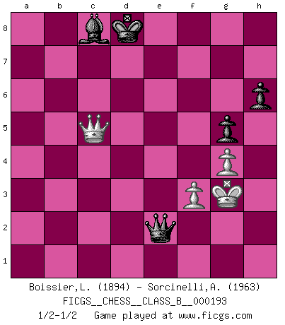 Last move : 1/2-1/2 2013 December 3 14:47:48 [Event "FICGS__CHESS__CLASS_B__000193"] [Site "FICGS"] [Date "2013.07.14"] [Round "1"] [White "Boissier,Lucien"] [Black "Sorcinelli,Andrea"] [Result "1/2-1/2"] [WhiteElo "1894"] [BlackElo "1963"] 1.d4 Nf6 2.Nf3 g6 3.Bg5 Bg7 4.Nbd2 O-O 5.c3 d5 6.e3 c5 7.Bd3 Qb6 8.Rb1 Nc6 9.O-O h6 10.Bh4 cxd4 11.exd4 Nd7 12.Re1 e5 13.c4 Nb4 14.c5 Qa5 15.Bf1 e4 16.a3 Nc6 17.b4 Qc7 18.b5 Na5 19.Bg3 Qd8 20.Ne5 Bxe5 21.Bxe5 Nxe5 22.dxe5 Qg5 23.f3 Rd8 24.f4 Qe7 25.Rc1 Be6 26.Qa4 Qc7 27.Qd4 Kg7 28.Be2 a6 29.a4 axb5 30.axb5 Nc4 31.Red1 Qe7 32.c6 bxc6 33.bxc6 Qc7 34.Nxc4 dxc4 35.Qxe4 Qb6+ 36.Kh1 Rxd1+ 37.Bxd1 Ra3 38.Bf3 Re3 39.Qc2 c3 40.Qf2 Qd4 41.Kg1 Qxf4 42.Bg4 Rf3 43.gxf3 Qxc1+ 44.Kg2 Bd5 45.c7 Bb7 46.e6 Qf4 47.h3 f5 48.Qc5 Qd2+ 49.Kf1 Ba6+ 50.Kg1 Qe1+ 51.Kh2 Qxe6 52.Qxc3+ Kf7 53.Kg2 fxg4 54.hxg4 g5 55.Qc5 Ke8 56.Qd4 Ke7 57.Qd8+ Kf7 58.Qd4 Qe2+ 59.Kg3 Ke6 60.c8Q+ Bxc8 61.Qb6+ Ke7 62.Qc5+ Kd8 1/2-1/2 King's Indian : Torre attack Kingside Castling by player Black (move 4) Kingside Castling by player White (move 9) 10 pieces endgame at move 54 : White KQPPP , Black KQBPP WHITE : King + 1 Queen 3 Pawns BLACK : King + 1 Queen 1 Bishop 2 Pawns Promotion Queen by player White (move 60) 9 pieces endgame at move 60 : White KQPP , Black KQBPP WHITE : King + 1 Queen 2 Pawns BLACK : King + 1 Queen 1 Bishop 2 Pawns This chess game ended in a draw. Follow this game move after move (download)In complicated positions, Bobby Fischer hardly had to be afraid of anybody. (Paul Keres) Wer nie einen Fehler gemacht hat, hat nie etwas Neues ausprobiert. (Albert Einstein) De eso se trata el Ajedrez. Un día le das una lección a tu oponente y al día siguiente el te da una a tí. (Bobby Fischer) Il n'y a pas eu de défaite parce que je ne crois pas que cet ordinateur ait jamais existé. IBM a triché en refusant d'imprimer les modes de recherche de la machine. C'est évident, pendant le match, des coups décisifs ont été joués par des êtres humains. Aujourd'hui, les meilleurs spécialistes en informatique ne peuvent toujours pas expliquer comment Deep-Blue a pu jouer contre la logique des ordinateurs. IBM a gagné une guerre de communication, mais ils sont incapables de prouver que l'ordinateur a gagné tout seul. (Garry Kasparov) I believe in luck. How else can you explain the success of those you dislike ? (Jean Cocteau)