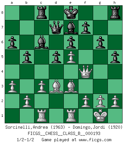 Last move : 1/2-1/2 2013 September 18 19:44:24 [Event "FICGS__CHESS__CLASS_B__000193"] [Site "FICGS"] [Date "2013.07.14"] [Round "1"] [White "Sorcinelli,Andrea"] [Black "Domingo,Jordi"] [Result "1/2-1/2"] [WhiteElo "1963"] [BlackElo "1920"] 1.d4 b5 2.e4 a6 3.Bd3 e6 4.Nf3 c5 5.c3 Bb7 6.O-O Nf6 7.Re1 h6 8.Nbd2 d5 9.e5 Nfd7 10.dxc5 Nxc5 11.Bc2 Nc6 12.Nd4 Qc7 13.N2b3 Rc8 14.Nxc6 Bxc6 15.Nxc5 Bxc5 16.Qg4 g6 17.Be3 h5 18.Qf4 Be7 19.Bd3 Qb7 20.Rac1 Qd7 21.a3 1/2-1/2 Polish defense Kingside Castling by player White (move 6) This chess game ended in a draw. Follow this game move after move (download)Capture of the adverse King is the ultimate but not the first object of the game. (William Steinitz) Schach ist ein schwarz-weisser Dschungel. (Garry Kasparov) Tu cuerpo tiene que estar en óptima condición. Tu Ajedrez se deteriora como lo hace tu cuerpo. No puedes separar la mente y el cuerpo. (Bobby Fischer) Nous vivons dans un monde échiquéen : chaque jour qui passe est un défi à relever. (Philosophe Sasha) The only thing that matters is the evidence. (Horatio Caine, C.S.I. Miami)