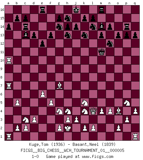 Last move : 1-0 2013 October 14 4:13:25 [Event "FICGS__BIG_CHESS__WCH_TOURNAMENT_01__000005"] [Site "FICGS"] [Date "2013.07.15"] [Round "1"] [White "Kuge,Tom"] [Black "Basant,Neel"] [Result "1-0"] [WhiteElo "1936"] [BlackElo "1839"] 1.j2-k4 j15-h13 2.e2-e4 h16-o10 3.h2-g4 n15-n14 4.m2-m4 b16-c14 5.f1-c4 m15-m13 6.d2-d3 l16-m15 7.k1-l3 d15-d13 8.b1-c3 e15-e13 9.h1-l4 o16-m14 10.c1-h6 f16-c13 11.p1-o3 g16-j15 12.p2-p3 m15-g10 13.o1-p2 c16-h11 14.l1-o4 p16-o14 15.g1-j2 k16-l14 16.j1-h2 j15-k13 17.n2-n4 f15-f13 18.j2-h4 q15-q13 19.q2-q4 o14-n12 20.e4-e5 p15-p13 21.o3-p5 o15-o13 22.e5-e6 e16-e14 23.a2-a4 c14-e15 24.c4-b5 a16-e16 25.p2-q3 h11-q3 26.p5-q3 g10-b5 27.a4-b5 a15-a14 28.a1-a4 e15-g14 29.f2-f4 m14-o12 30.h6-g7 q16-p16 31.f4-f5 o12-m14 32.q3-p5 p16-p14 33.e1-a1 e14-c14 34.a4-a10 o10-o11 35.a1-a7 e13-e12 36.m1-a1 o11-m11 37.l3-k5 1-0 This big chess game has been lost on time (started : 2013.07.15 13:37:26) Follow this game move after move (download)I like the moment when I break a man's ego. (Bobby Fischer) Im Internet Chess Club betrug mein Rating vorübergehend 3350 ELO-Punkte. (Sergej Karjakin) De eso se trata el Ajedrez. Un día le das una lección a tu oponente y al día siguiente el te da una a tí. (Bobby Fischer) Je menace de comprendre la position. (Anonyme) The best weapon against an enemy is another enemy. (Friedrich Nietzsche)