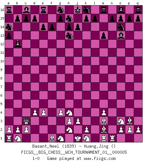 Last move : 1-0 2013 November 5 10:35:21 [Event "FICGS__BIG_CHESS__WCH_TOURNAMENT_01__000005"] [Site "FICGS"] [Date "2013.07.15"] [Round "1"] [White "Basant,Neel"] [Black "Huang,Jing"] [Result "1-0"] [WhiteElo "1839"] [BlackElo ""] 1.j2-h4 j15-h13 2.g2-g4 m15-m13 3.p1-o3 p16-o14 4.m2-m4 h16-o10 5.e2-e4 l16-o13 6.n2-n4 a15-a13 7.h1-f3 f15-f14 8.o1-c12 e15-e14 9.d2-d4 o10-c10 10.f3-c3 c10-l2 11.c1-k8 b16-a14 12.k8-p3 l2-n4 13.q1-n1 n4-l2 14.f1-a6 f16-b12 15.c12-m3 l2-f7 16.l1-m2 f7-f2 17.e1-f1 f2-f1 18.a6-f1 1-0 Follow this game move after move (download)We must make sure that Chess will not be like a dead language, very interesting, but for a very small group. (Sytze Faber) Frage: Was machen Sie mit den Preisen? Anwort: Ich habe Angst, dass meine Freundin davon neue Kleider kauft. (Loek van Wely) Aunque la mayoría de la gente disfruta observar las partidas de los grandes Maestros de ataque, algunos de los jugadores mas notables en la historia han sido los jugadores silenciosos posicionales. Lentamente ellos te aplastan despojandote de tu espacio, congestionando tus piezas y dejandote virtualmente sin nada que hacer. (Yasser Seirawan) Mais n'est-ce pas déjà le limiter injurieusement que d'appeler les échecs un jeu? N'est-ce pas aussi une science, un art, ou quelque chose qui, comme le cercueil de Mahomet entre ciel et terre, est suspendu entre l'un et l'autre, et qui réunit un nombre incroyable de contraires ? (Stefan Zweig) Methinks King Thibault should dub Marius Zubac a knight of the square board... I mean table, henceforth addressing him as Sir Marius, and bestow on him a suitable land from the kingdom of FICGS & marry him off to a worthy, fair maiden, lest he slice our heads with his mighty sword in his wrath. (Dinesh De Silva)