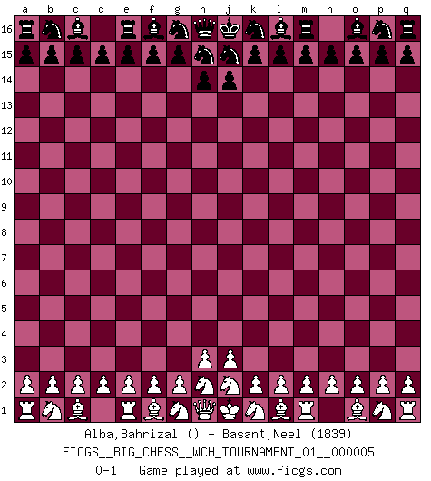 Last move : 0-1 2013 August 14 18:9:40 [Event "FICGS__BIG_CHESS__WCH_TOURNAMENT_01__000005"] [Site "FICGS"] [Date "2013.07.15"] [Round "1"] [White "Alba,Bahrizal"] [Black "Basant,Neel"] [Result "0-1"] [WhiteElo ""] [BlackElo "1839"] 0-1 This big chess game has been lost on time (started : 2013.07.15 13:37:26) Follow this game move after move (download)A man that will take back a move at Chess will pick a pocket. (Richard Fenton) Heutzutage gewinnt im Turnier nicht derjenige Spieler, der weitreichende Pläne entwirft, sondern einfach jener, der Zug um Zug kämpft. (David Bronstein) Yo no le temo a Spassky. Todos saben que yo soy el mejor. Uno no necesita un torneo para probarlo. (Bobby Fischer) Vous m'avez demandé de vous exposer quel est le fondement de la prière. Je ne fais que préparer les pièces du jeu sur la table... Nous sera-t-il permis d'en adopter les règles et si nous les appliquons scrupuleusement nous ne tarderons pas à faire mat le Roi divin ! Il ne pourra échapper à nos mains. (Sainte Thérèse d'Avila, Chemin de perfection) He who laughs last probably does not get the joke. (Unknown)
