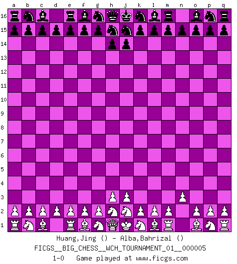 Last move : 1-0 2013 August 15 18:9:57 [Event "FICGS__BIG_CHESS__WCH_TOURNAMENT_01__000005"] [Site "FICGS"] [Date "2013.07.15"] [Round "1"] [White "Huang,Jing"] [Black "Alba,Bahrizal"] [Result "1-0"] [WhiteElo ""] [BlackElo ""] 1.n2-n3 1-0 This big chess game has been lost on time (started : 2013.07.15 13:37:26) Follow this game move after move (download)The stomach is an essential part of the Chess master. (Bent Larsen) Der 70jährige Viktor Kortschnoi: Die Rentenanstalt wollte mich zwingen in Rente zu gehen. Meine Frau erhält jetzt eine Pension- und ich zahle weiter in die Rentenkasse ein! (Viktor Kortschnoi) Tu sabes que vas a perder. Aún cuando tenía la ventaja, yo sabía que iba a perder. - al estar jugando con Fischer (Andrew Soltis) Les écrivains ont utilisé les échecs pour analyser les côtés extrêmes de la nature humaine. Dans ce cadre, les échecs offrent un champ d'expérimentation idéal. Mais on pourrait faire la même chose avec la peinture. Et là, en vous référant à Van Gogh, vous ne tirerez pas de conclusion définitive sur les peintres. (Gary Kasparov) It is not enough to be a good player... you must also play well. (Siegbert Tarrasch)