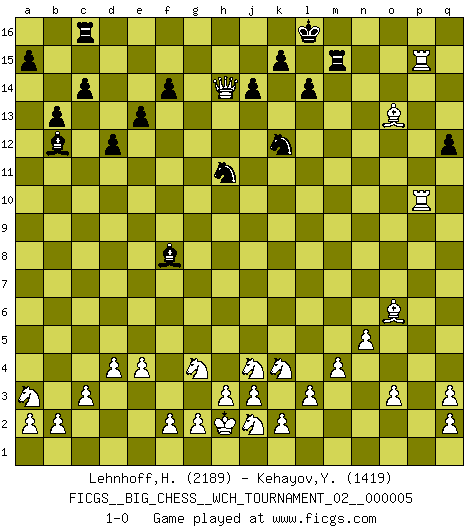 Last move : 1-0 2013 September 30 22:42:18 [Event "FICGS__BIG_CHESS__WCH_TOURNAMENT_02__000005"] [Site "FICGS"] [Date "2013.07.15"] [Round "1"] [White "Lehnhoff,Heinz-Georg"] [Black "Kehayov,Yulian"] [Result "1-0"] [WhiteElo "2189"] [BlackElo "1419"] 1.j2-k4 j15-k13 2.h1-o7 h15-g13 3.o7-o15 p16-o14 4.o15-f7 h16-o10 5.m2-m4 e15-e13 6.e2-e4 m15-m13 7.d2-d4 n15-n13 8.b1-a3 f15-f14 9.p1-q3 d15-d13 10.n2-n4 l16-o13 11.f1-b5 c16-h11 12.b5-h11 g13-h11 13.f7-f13 k16-h15 14.f13-h11 b16-a14 15.h2-g4 g16-j15 16.k1-h2 j15-h13 17.l1-p5 f16-b12 18.g1-j2 o16-f8 19.c1-l9 d13-d12 20.c2-c3 j16-j15 21.l9-n11 o10-n11 22.h11-n11 m13-m12 23.n11-n13 o13-k9 24.o1-f9 q16-n16 25.n13-p11 p15-p14 26.o2-o3 n16-n11 27.p11-l7 o14-m13 28.l7-j9 k9-q3 29.p2-q3 m16-n16 30.f9-k13 n16-n13 31.k13-g10 c15-c14 32.j9-m12 h13-k14 33.n4-n5 e16-m16 34.l2-l3 n13-n12 35.m12-m7 a16-d16 36.h2-j4 m13-k12 37.m7-d7 h15-g13 38.q1-p1 a14-c13 39.p5-o6 g13-h11 40.j1-h2 n11-n10 41.p1-p8 c13-d11 42.g10-j8 n12-n13 43.d7-d11 q15-q13 44.p8-p14 b15-b13 45.m1-p1 n13-n16 46.p1-p8 n16-p16 47.e1-p1 p16-p14 48.p8-p14 n10-n16 49.p1-p8 n16-p16 50.a1-p1 p16-p14 51.p8-p14 d16-c16 52.d11-g8 j15-h15 53.p1-p10 q13-q12 54.j8-e12 h15-j15 55.g8-g15 k14-h15 56.g15-h15 j15-k16 57.h15-h14 k16-l16 58.e12-j8 l15-l14 59.p14-p15 m16-m15 60.j8-o13 1-0 Follow this game move after move (download)Nothing excites jaded Grandmasters more than a theoretical novelty. (Dominic Lawson) Wer wird heute Abend ihr Gegner sein? -- Heute Abend spiele ich gegen die schwarzen Steine. (Akiba Rubinstein) El Ajedrez es como la guerra en un tablero. (Bobby Fischer) Assurément je connaissais par expérience le mystérieux attrait de ce jeu royal, le seul entre tous les jeux inventés par les hommes qui échappe souverainement à la tyrannie du hasard, le seul où l'on ne doive sa victoire qu'à son intelligence ou plutôt à une certaine forme d'intelligence. Mais n'est-ce pas déjà le limiter injurieusement que d'appeler les échecs un jeu ? N'est-ce pas une science, un art ou quelque chose qui, comme le cercueil de Mahomet entre ciel et terre, est suspendu entre l'un et l'autre, et qui réunit un nombre incroyable de contraires ? [...] C'est une pensée qui ne mène à rien, une mathématique qui n'établit rien, un art qui ne laisse pas d'uvre, une architecture sans matière; et il l'a prouvé néanmoins qu'il était plus durable, à sa manière, que les livres ou que tout autre monument, ce jeu unique qui appartient à tous les peuples et à tous les temps, et dont personne ne sait quel dieu en fit don à la terre pour tuer l'ennui, pour aiguiser l'esprit et stimuler l'âme. Où commence-t-il, où finit-il ? (Stefan Zweig) Looking at the proliferation of personal web pages on the Net, it looks like very soon everyone on Earth will have 15 megabytes of fame. (M.G. Sriram)