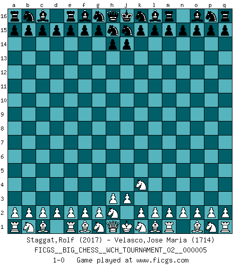 Last move : 1-0 2013 August 14 18:9:40 [Event "FICGS__BIG_CHESS__WCH_TOURNAMENT_02__000005"] [Site "FICGS"] [Date "2013.07.15"] [Round "1"] [White "Staggat,Rolf"] [Black "Velasco,Jose Maria"] [Result "1-0"] [WhiteElo "2017"] [BlackElo "1714"] 1.j2-k4 1-0 This big chess game has been lost on time (started : 2013.07.15 13:39:23) Follow this game move after move (download)Nowadays, when you're not a grandmaster at 14, you can forget about it. (Anand Viswanathan) Das Schach ist nichts für kleine Geister, es beansprucht einen vollen Mann, der sich nicht sklavisch an das Überlieferte hält, sondern selbständig die Tiefen des Spiels zu ergründen sucht. (Wilhelm Steinitz) El Ajedrez es un juego terrible. Si no dominas el centro, tu oponente tiene una posición mas libre. Si tu tienes el centro, entonces realmente tienes algo de que preocuparte. (Siegbert Tarrasch) Lorsque vous vous retrouvez devant une position atroce, ne tendez pas un ultime piège dérisoire avec l'intention d'abandonner si l'adversaire le déjoue ! Faites-vous plutôt un devoir de résister comme si votre vie en dépendait. Jouez le coup qui vous déplairait au centuple si vous étiez dans la peau de votre tortionnaire ! Perfection is achieved, not when there is nothing more to add, but when there is nothing left to take away. (Antoine de Saint-Exupéry)