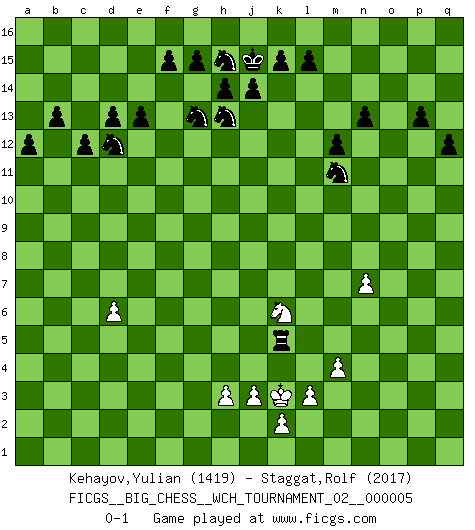 Last move : 0-1 2014 January 23 13:57:22 [Event "FICGS__BIG_CHESS__WCH_TOURNAMENT_02__000005"] [Site "FICGS"] [Date "2013.07.15"] [Round "1"] [White "Kehayov,Yulian"] [Black "Staggat,Rolf"] [Result "0-1"] [WhiteElo "1419"] [BlackElo "2017"] 1.j2-k4 j15-k13 2.h1-o7 h15-g13 3.o7-o15 p16-o14 4.o15-c4 b16-c14 5.m2-m4 n15-n13 6.n2-n4 m15-m13 7.d2-d4 d15-d13 8.e2-e4 l16-p12 9.f1-e2 p12-o13 10.e2-f3 c16-k9 11.o1-j6 e15-e13 12.l1-p5 k16-h15 13.p1-o3 f16-b12 14.g1-j2 o16-f8 15.c1-l9 q16-o16 16.b1-c3 h16-k14 17.j6-l8 k9-l8 18.f3-l8 g16-f14 19.h2-g4 m13-m12 20.k1-h2 b12-e9 21.l9-n7 k13-l11 22.k4-l6 o13-n14 23.c4-c6 n14-m15 24.c6-e6 m15-n14 25.e6-d7 o14-n12 26.j2-k4 n14-m15 27.d7-f7 m15-n14 28.f7-d7 o16-o14 29.j1-j2 n14-m15 30.d7-b7 e9-b12 31.m1-m3 m16-o16 32.n4-n5 m15-j12 33.l8-j6 c14-d12 34.j6-h5 k14-d8 35.d4-d5 j12-h13 36.b7-f7 n12-m10 37.f7-e8 d8-b10 38.e8-b5 b10-j10 39.e4-e5 e16-e14 40.e1-e4 e14-b14 41.b5-f9 h13-e10 42.f9-l9 e10-m3 43.k4-m3 f14-h13 44.m3-k4 f8-j11 45.l9-j7 j10-j7 46.l6-j7 j11-n7 47.p5-n7 b12-e9 48.k4-l6 b14-b2 49.e4-e2 o14-p14 50.a1-b1 b2-b1 51.q1-b1 p14-p2 52.o3-m2 e9-m2 53.l2-l3 p2-o2 54.h2-j4 b15-b14 55.b1-b10 m2-q6 56.n7-l9 m10-k11 57.e2-e4 k11-l9 58.q2-q3 o16-o10 59.b10-o10 o2-o10 60.c3-b5 j16-j15 61.f2-f3 a16-o16 62.q3-q4 o10-o4 63.q4-q5 o4-o5 64.a2-a4 o5-q5 65.c2-c3 o16-o10 66.d5-d6 o10-h10 67.h5-g6 q6-n9 68.e4-c4 c15-c13 69.c4-c9 l11-n10 70.c9-a9 a15-a13 71.a9-b9 b14-b13 72.b9-c9 c13-c12 73.c9-b9 h10-a10 74.g6-c2 q5-q11 75.b9-c9 p15-p13 76.c2-f5 a10-a4 77.c9-c8 q15-q13 78.f5-o13 q11-b11 79.c3-c4 q13-q12 80.o13-k9 a13-a12 81.j2-h2 a4-a10 82.c8-p8 n9-p11 83.k9-m11 l9-m11 84.p8-n8 n10-l9 85.n8-j8 l9-j8 86.h2-j2 a10-a4 87.g4-e3 p11-f2 88.e3-g4 f2-e1 89.j2-k3 a4-c4 90.b5-a3 c4-c3 91.a3-b5 b11-b5 92.k3-j2 b5-b2 93.n5-n6 b2-g2 94.j2-k3 c3-f3 95.l6-j5 e1-j5 96.g4-j5 f3-f5 97.j5-l4 f5-e5 98.j7-g6 g2-g6 99.n6-n7 j8-k6 100.l4-k6 g6-k6 101.j4-k6 e5-k5 0-1 Follow this game move after move (download)Chess is a fighting game which is purely intellectual and includes chance. (Richard Reti) Lisa Lane, amerikanische Schachmeisterin, hatte Fischer einmal als stärksten lebenden Spieler bezeichnet. Antwort: Das ist richtig, aber Lisa Lane ist eigentlich nicht in der Lage, das zu beurteilen. (Robert James Fischer) Te sientas frente a un tablero y repentinamente tu corazón brinca. Tu mano tiembla al tomar una pieza y moverla. Pero lo que el Ajedrez te enseña es que tu debes permanecer ahí con calma y pensar de que si realmente es una buena idea o de que si hay otras ideas mejores. (Stanley Kubrick) L'ordinateur a tué l'originalité. Il n'y a plus guère d'aventures sur l'échiquier. (Jacob Murray) The general who wins the battle makes many calculations in his temple before the battle is fought. The general who loses makes but few calculations beforehand. (Sun Tzu)