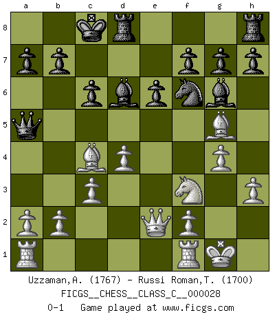 Last move : 0-1 2007 July 8 10:18:55 [Event "FICGS__CHESS__CLASS_C__000028"] [Site "FICGS"] [Date "2007.02.04"] [Round "1"] [White "Uzzaman,Ashik"] [Black "Russi Roman,Tano-Urayoan"] [Result "0-1"] [WhiteElo "1767"] [BlackElo "1700"] 1.e4 c6 2.d4 d5 3.Nc3 dxe4 4.Nxe4 Nd7 5.Bd3 Ngf6 6.Nf3 Nxe4 7.Bxe4 Nf6 8.Bd3 Bg4 9.Be3 e6 10.Qe2 Qa5 11.c3 Bd6 12.h3 Bh5 13.O-O Qd5 14.g4 Bg6 15.Bc4 Qa5 16.Bg5 O-O-O 0-1 This chess game has been lost on time (started : 2007.02.04 12:14:53) Caro-Kann : Steinitz variation Kingside Castling by player White (move 13) Queenside Castling by player Black (move 16) Player Black won this chess game. Follow this game move after move (download)Whoever sees no other aim in the game than that of giving checkmate to one's opponent will never become a good Chess player. (Euwe) Wenn ich Weiß habe gewinne ich weil ich Weiß habe, wenn ich Schwarz habe gewinne ich weil ich Bogoljubov bin. (Efim Bogoljubov) Si no le temes a Spassky, entonces elimino el elemento del dinero. (Jim Slater) Que feriez-vous si vous étiez en train de jouer aux échecs et que la fin du monde arrive ? Je continuerais à jouer. (Saint Borromée) The production of too many useful things results in too many useless people. (Karl Marx)