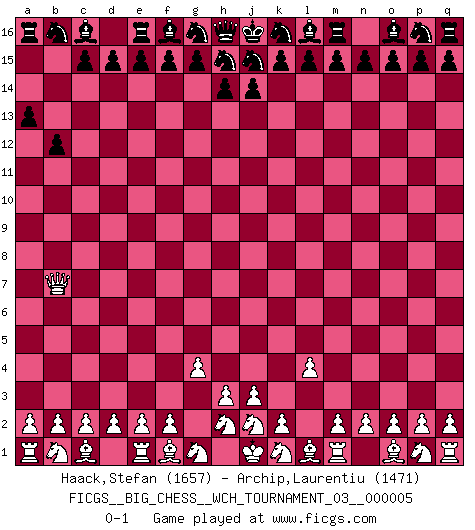 Last move : 0-1 2013 August 31 12:59:46 [Event "FICGS__BIG_CHESS__WCH_TOURNAMENT_03__000005"] [Site "FICGS"] [Date "2013.07.15"] [Round "1"] [White "Haack,Stefan"] [Black "Archip,Laurentiu"] [Result "0-1"] [WhiteElo "1657"] [BlackElo "1471"] 1.g2-g4 b15-b13 2.l2-l4 a15-a13 3.h1-b7 b13-b12 0-1 This big chess game has been lost on time (started : 2013.07.15 13:40:15) Follow this game move after move (download)After a bad opening, there is hope for the middle game. After a bad middle game, there is hope for the endgame. But once you are in the endgame, the moment of truth has arrived. (Edmar Mednis) Schach wird sich dank seiner hohen kulturellen Tradition immer durchsetzen. In näherer Zukunft womöglich sogar als Gegenreaktion auf die maßlose Reizüberflutung im Freizeit- und Spielbereich. (Garry Kasparov) Tu puedes aprender mucho mas de una partida que pierdas que de una partida ganada. Tendras que perder cientos de partidas antes de llegar a ser un buen jugador. (Jose Raul Capablanca) Les erreurs sont comme les malheurs, elles n'arrivent jamais seules. (Siegbert Tarrasch) A computer lets you make more mistakes faster than any invention in human history - with the possible exceptions of handguns and tequila. (Mitch Ratcliffe)