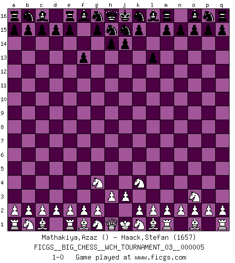 Last move : 1-0 2013 September 3 1:14:5 [Event "FICGS__BIG_CHESS__WCH_TOURNAMENT_03__000005"] [Site "FICGS"] [Date "2013.07.15"] [Round "1"] [White "Mathakiya,Azaz"] [Black "Haack,Stefan"] [Result "1-0"] [WhiteElo ""] [BlackElo "1657"] 1.j2-k4 f15-f13 2.h2-g4 l15-l13 3.p1-o3 1-0 This big chess game has been lost on time (started : 2013.07.15 13:40:15) Follow this game move after move (download)The hardest game to win is a won game. (Emanuel Lasker) Es tut gut, die Entwicklungsperiode von, [...] demokratischem Geist durchdringen zu lassen. Wie undemokratisch wäre es doch beispielsweise, den einen Offizier große Spaziertouren vornehmen zu lassen, während die anderen zu Hause säßen und sich entsetzlich langweilten. (Aaron Nimzowitsch) Si el Ajedrez es una ciencia, es la mas inexacta. Si el Ajedrez es un arte, es demasiado inexacto para ser visto como tal. Si el Ajedrez es un deporte, es demasiado esotérico. Si el Ajedrez es un juego, es demasiado exigente para ser solo un juego. Si el Ajedrez es una aventura, es una muy demandante. Si el Ajedrez es una pasión, es una muy gratificante. Si el Ajedrez es la vida, es una muy triste. (Anónimo) Que feriez-vous si vous étiez en train de jouer aux échecs et que la fin du monde arrive ? Je continuerais à jouer. (Saint Borromée) Begin at the beginning and go on till you come to the end; then stop. (Lewis Carrol, Alice in Wonderland)