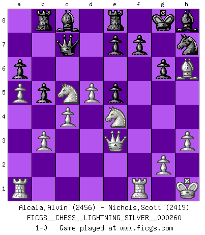 Last move : 1-0 2013 July 15 19:55:3 [Event "FICGS__CHESS__LIGHTNING_SILVER__000260"] [Site "FICGS"] [Date "2013.07.15"] [Round "1"] [White "Alcala,Alvin"] [Black "Nichols,Scott"] [Result "1-0"] [WhiteElo "2456"] [BlackElo "2419"] 1.c4 Nf6 2.Nc3 g6 3.d4 Bg7 4.e4 d6 5.f3 O-O 6.Be3 c6 7.Bd3 Nfd7 8.Nge2 c5 9.d5 Ne5 10.O-O Nxd3 11.Qxd3 Nd7 12.b3 a6 13.a4 Rb8 14.Qd2 Re8 15.Bh6 Bf6 16.f4 Qa5 17.Qe3 Bh8 18.Kh1 Nf6 19.h3 Nd7 20.e5 dxe5 21.f5 Nf6 22.Ng3 Qb6 23.fxg6 hxg6 24.Nce4 Nh7 25.a5 Qc7 26.Nxc5 b5 27.Nge4 1-0 English Opening Kingside Castling by player Black (move 5) Kingside Castling by player White (move 10) Player White won this chess game. Follow this game move after move (download)With or without the title, Bobby Fischer was unquestionably the greatest player of his time. (Burt Hochberg) Man braucht nicht immer den besten Zug zu spielen: Ein Zug muß aktiv, unternehmungslustig, korrekt und schön sein. (David Bronstein) Aún deseo matar a Fischer. (Boris Spassky) Karpov est une pièce de musée. (Garry Kasparov) You can't play chess if you're groggy from pills. (Anatoly Karpov)