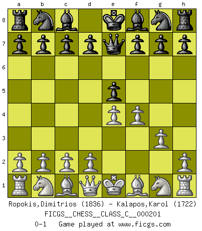 Last move : 0-1 2013 September 12 1:47:36 [Event "FICGS__CHESS__CLASS_C__000201"] [Site "FICGS"] [Date "2013.07.16"] [Round "1"] [White "Ropokis,Dimitrios"] [Black "Kalapos,Karol"] [Result "0-1"] [WhiteElo "1836"] [BlackElo "1722"] 1.e4 e5 2.f4 Qh4+ 3.g3 Qe7 0-1 This chess game has been lost on time (started : 2013.07.16 17:21:3) KGD : Keene's defense Player Black won this chess game. Follow this game move after move (download)The boy (then a 12 year old boy named Anatoly Karpov) doesn't have a clue about Chess, and there's no future at all for him in this profession. (Mikhail Botvinnik) Ich würde mich als ganz normalen Jungen bezeichnen [Im Alter von 12]. (Sergej Karjakin) Para mi, el Ajedrez es la vida y cada partida es como una nueva vida. Todo jugador de Ajedrez suele vivir muchas vidas durante su vida. (Eduard Gufeld) Les Echecs ont trois composantes : le temps, l'espace et le matériel en dernier. (Mikhail Tal) If you work for a living, why do you kill yourself working ? (Tuco to a chicken in The Good, The Bad and The Ugly)