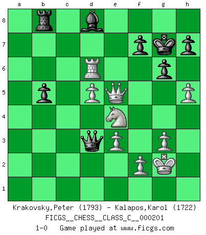 Last move : 1-0 2013 July 26 17:44:17 [Event "FICGS__CHESS__CLASS_C__000201"] [Site "FICGS"] [Date "2013.07.16"] [Round "1"] [White "Krakovsky,Peter"] [Black "Kalapos,Karol"] [Result "1-0"] [WhiteElo "1793"] [BlackElo "1722"] 1.c4 c5 2.g3 g6 3.Bg2 Nc6 4.Nc3 Bg7 5.Nf3 e5 6.O-O Nge7 7.a3 d6 8.d3 O-O 9.Rb1 a5 10.Bd2 Rb8 11.Re1 Bg4 12.Qc2 Qd7 13.e3 Bh3 14.Bxh3 Qxh3 15.Nd5 Qf5 16.Kg2 Rfe8 17.b4 cxb4 18.axb4 Nxd5 19.cxd5 Nxb4 20.Bxb4 axb4 21.Rxb4 Rec8 22.Qb3 Rc7 23.Nd2 Bf8 24.Ra1 Qh5 25.Ne4 Be7 26.Rb6 Qe2 27.Ra2 Qe1 28.Rc2 Rxc2 29.Qxc2 Bd8 30.Rxd6 Qb4 31.h4 Qa3 32.h5 b5 33.Qc6 Qxd3 34.Qe8+ Kg7 35.Qxe5+ 1-0 English : Symmetrical variation Kingside Castling by player White (move 6) Kingside Castling by player Black (move 8) Player White won this chess game. Follow this game move after move (download)You are for me the Queen on d8 and I am the Pawn on d7 !! (Eduard Gufeld) Es ist besser die Steine des Gegners zu opfern. (Savielly Grigorievitsch Tartakower) El Ajedrez es un expediente tonto que hace creer a la gente inactiva que hacen una cosa muy astuta cuando solamente estan perdiendo su tiempo. (George Bernard Shaw) Shah mat. Le roi est mort. Cri de fierté d'un joueur venant de terrasser son adversaire, courtoisement, sans effusion de sang. This is where the fun begins. (Anakin Skywalker in Star Wars ep.3)