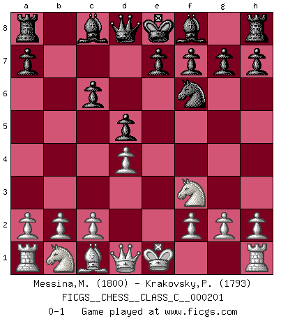 Last move : 0-1 2013 August 28 0:53:5 [Event "FICGS__CHESS__CLASS_C__000201"] [Site "FICGS"] [Date "2013.07.16"] [Round "1"] [White "Messina,Miguel Angel"] [Black "Krakovsky,Peter"] [Result "0-1"] [WhiteElo "1800"] [BlackElo "1793"] 1.e4 c6 2.Nf3 d5 3.exd5 cxd5 4.d4 Nf6 5.Bb5+ Nc6 6.Bxc6+ bxc6 0-1 This chess game has been lost on time (started : 2013.07.16 17:21:3) Caro-Kann defense Player Black won this chess game. Follow this game move after move (download)If I win a tournament, I win it by myself. I do the playing. Nobody helps me. (Bobby Fischer) Ich spiele 70 Eröffnungssysteme. (Viktor Kortschnoi) El jugador de combinación piensa hacia adelante; comienza de la posición dada y trabaja las movidas contundentes en su mente. (Emanuel Lasker) Vous n'êtes pas toujours obligé de jouer le meilleur coup. Un coup doit être actif, entreprenant, correct et beau ! (David Bronstein) Opportunities multiply as they are seized. (Sun Tzu)