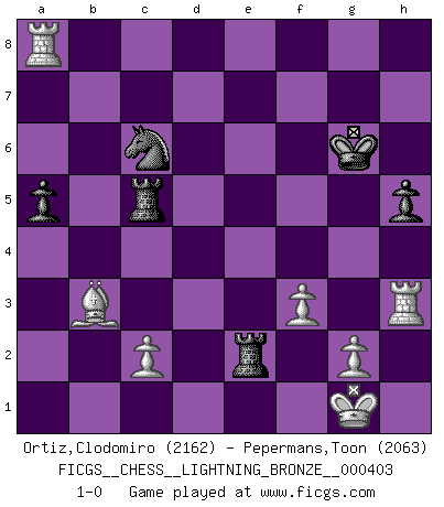 Last move : 1-0 2013 July 16 20:6:57 [Event "FICGS__CHESS__LIGHTNING_BRONZE__000403"] [Site "FICGS"] [Date "2013.07.16"] [Round "1"] [White "Ortiz,Clodomiro"] [Black "Pepermans,Toon"] [Result "1-0"] [WhiteElo "2162"] [BlackElo "2063"] 1.e4 c6 2.d4 d5 3.e5 Bf5 4.Nf3 e6 5.Be2 c5 6.Be3 Qb6 7.Nc3 Nc6 8.O-O Qxb2 9.Qe1 cxd4 10.Bxd4 Nxd4 11.Nxd4 Bb4 12.Rb1 Bxc3 13.Rxb2 Bxe1 14.Rxe1 b6 15.Bb5+ Kf8 16.Nxf5 exf5 17.Rb3 g6 18.Rc3 a6 19.Ra3 a5 20.Ba4 Rb8 21.Rb1 Kg7 22.Rc3 Nh6 23.h3 f4 24.Rc7 Nf5 25.Bd7 Ne7 26.Rd1 b5 27.a4 bxa4 28.Bxa4 Rb4 29.Ra1 Kf8 30.Bb3 Rb5 31.Rd1 g5 32.Ba2 d4 33.e6 fxe6 34.Bxe6 Re5 35.Bc4 Kg7 36.Rxd4 Rc8 37.Ra7 R8c5 38.f3 h6 39.h4 Kf8 40.Rd8+ Kg7 41.Bb3 gxh4 42.Rd4 Kg6 43.Rxf4 h5 44.Rxh4 Nc6 45.Ra8 Re2 46.Rh3 1-0 Caro-Kann : Advance variation Kingside Castling by player White (move 8) Player White won this chess game. Follow this game move after move (download)The tactician knows what to do when there is something to do; whereas the strategian knows what to do when there is nothing to do. (Gerald Abrahams) Verschiedene, sehr schätzbare und im Laufe des Lebens nützliche Eigenschaften des Geistes können durch das Schachspiel erworben und gekräftigt werden, so dass sie zu Gewohnheiten werden, die uns nie im Stich lassen. (Benjamin Franklin) El juego de Damas es para vagabundos. (Paul Morphy) Lorsque vous vous retrouvez devant une position atroce, ne tendez pas un ultime piège dérisoire avec l'intention d'abandonner si l'adversaire le déjoue ! Faites-vous plutôt un devoir de résister comme si votre vie en dépendait. Jouez le coup qui vous déplairait au centuple si vous étiez dans la peau de votre tortionnaire ! Luck never made a man wise. (Seneca, Letters to Lucilius)