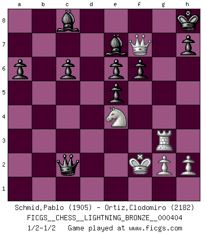 Last move : 1/2-1/2 2013 July 16 20:59:12 [Event "FICGS__CHESS__LIGHTNING_BRONZE__000404"] [Site "FICGS"] [Date "2013.07.16"] [Round "1"] [White "Schmid,Pablo"] [Black "Ortiz,Clodomiro"] [Result "1/2-1/2"] [WhiteElo "1905"] [BlackElo "2182"] 1.Nf3 c5 2.e4 d6 3.d4 cxd4 4.Nxd4 Nf6 5.Nc3 a6 6.Bg5 e6 7.f4 Qb6 8.Qd2 Qxb2 9.Rb1 Qa3 10.f5 Nc6 11.fxe6 fxe6 12.Nxc6 bxc6 13.e5 dxe5 14.Bxf6 gxf6 15.Ne4 Qxa2 16.Rd1 Be7 17.Be2 O-O 18.O-O Ra7 19.Rf3 Kh8 20.Rg3 Rd7 21.Qh6 Rxd1+ 22.Bxd1 Rf7 23.Qh5 Qa5 24.Kf1 Qd8 25.Qxf7 Qxd1+ 26.Kf2 Qxc2+ 27.Kf3 Qd1+ 28.Kf2 Qc2+ 29.Kf3 Qd1+ 30.Kf2 Qc2+ 1/2-1/2 Reti Opening Kingside Castling by player Black (move 17) Kingside Castling by player White (move 18) This chess game ended in a draw. Follow this game move after move (download)There's never before been a Chess player with such a thorough knowledge of the intricacies of the game and such an absolutely indomitable will to win. I think Bobby is the greatest player that ever lived. (Lisa Lane) Das ganze Leben mit einer Ehefrau ist wie ein Endspiel mit ungleichfarbigen Läufern. (Viktor Kortschnoi) El Ajedrez por encima de todo... ¡es una pelea!. (Emanuel Lasker) Je ne crois pas en la psychologie, je crois aux bons coups. (Robert Fischer) Ah, beer! The cause of, and the solution to, all of life's problems. (Homer Simpson)
