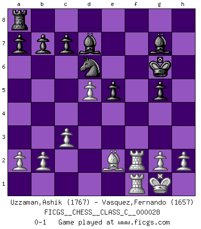 Last move : 0-1 2007 July 28 13:10:12 [Event "FICGS__CHESS__CLASS_C__000028"] [Site "FICGS"] [Date "2007.02.04"] [Round "1"] [White "Uzzaman,Ashik"] [Black "Vasquez,Fernando"] [Result "0-1"] [WhiteElo "1767"] [BlackElo "1657"] 1.e4 e5 2.f4 exf4 3.Nf3 d6 4.d4 g5 5.Bc4 g4 6.Bxf4 gxf3 7.Qxf3 Bg7 8.e5 Nc6 9.Qh5 Qe7 10.Bg5 Bf6 11.O-O dxe5 12.Nc3 h6 13.Nd5 hxg5 14.Nxe7 Rxh5 15.Nxg8 Bh8 16.Bxf7+ Kf8 17.Bxh5 Kxg8 18.d5 Nd4 19.c3 Nf5 20.Rf2 Nd6 21.Raf1 Bd7 22.Bf7+ Kh7 23.Bh5 Bg7 24.Be2 Kg6 0-1 This chess game has been lost on time (started : 2007.02.04 12:14:53) KGA : Fischer defense Kingside Castling by player White (move 11) Player Black won this chess game. Follow this game move after move (download)Nothing excites jaded Grandmasters more than a theoretical novelty. (Dominic Lawson) Später, ... hatte ich zunehmend Erfolg in entscheidenden Partien. Vielleicht weil ich eine einfache Wahrheit erkannte: nicht nur ich hatte Angst, auch mein Gegner. (Mikhail Nekhemyevich Tal) El Ajedrez es como la guerra en un tablero. (Bobby Fischer) Avant la finale, les dieux ont créé le milieu de partie. (Tarrasch) Real knowledge is to know the extent of one's ignorance. (Confucius)