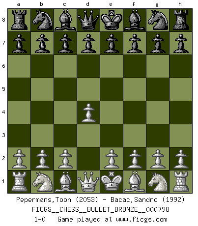 Last move : 1-0 2013 July 16 23:6:21 [Event "FICGS__CHESS__BULLET_BRONZE__000798"] [Site "FICGS"] [Date "2013.07.16"] [Round "1"] [White "Pepermans,Toon"] [Black "Bacac,Sandro"] [Result "1-0"] [WhiteElo "2053"] [BlackElo "1992"] 1.d4 1-0 This chess game has been lost on time (started : 2013.07.16 22:54:44) Queen's pawn Player White won this chess game. Follow this game move after move (download)In Fischer's hands, a slight theoretical advantage is as good a being a Queen ahead. (Isaac Kashdan) Irgendwie scheint mir sonntags früh um 9 Uhr der Killerinstinkt verloren gegangen zu sein. (Alexej Shirov) Cada Peón es una Reina en potencia. (James Mason) Même si l'adversaire joue le coup analysé précédemment, recommencez l'analyse en voyant la nouvelle position. Première règle de Blumenfeld Some people are so afraid to die that they never begin to live. (Henry Van Dyke)