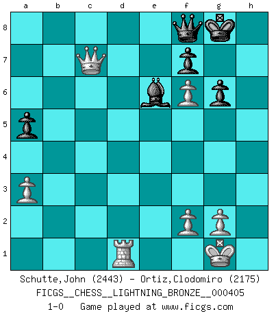 Last move : 1-0 2013 July 17 18:33:22 [Event "FICGS__CHESS__LIGHTNING_BRONZE__000405"] [Site "FICGS"] [Date "2013.07.17"] [Round "1"] [White "Schutte,John"] [Black "Ortiz,Clodomiro"] [Result "1-0"] [WhiteElo "2443"] [BlackElo "2175"] 1.e4 e5 2.Nf3 Nc6 3.Bb5 a6 4.Ba4 Nf6 5.O-O Be7 6.Re1 b5 7.Bb3 d6 8.c3 O-O 9.d4 Bg4 10.Be3 exd4 11.cxd4 d5 12.e5 Ne4 13.Nc3 Nxc3 14.bxc3 Na5 15.Bc2 Nc4 16.Qd3 g6 17.Bh6 Re8 18.h3 Bf5 19.Qe2 Qd7 20.Bb3 Rab8 21.Ng5 Qd8 22.h4 Qd7 23.Qf3 Bd8 24.Bd1 b4 25.cxb4 Rxb4 26.a3 Rb2 27.Be2 Nd2 28.Qf4 Nc4 29.h5 a5 30.Bxc4 dxc4 31.hxg6 hxg6 32.d5 Qxd5 33.Rad1 Qc5 34.Qh4 Bxg5 35.Bxg5 Rb6 36.Bf6 Rxf6 37.exf6 Rxe1+ 38.Rxe1 Qf8 39.Qxc4 Qd8 40.Qh4 Be6 41.Rb1 Qf8 42.Qh2 Bf5 43.Rd1 Be6 44.Qxc7 1-0 Ruy Lopez : Closed Kingside Castling by player White (move 5) Kingside Castling by player Black (move 8) Player White won this chess game. Follow this game move after move (download)When in doubt... play Chess ! (Tevis) Gewinnen beim Schach fördert das Selbstvertrauen. Beim Sex spüre ich sowas nicht... (Garry Kasparov) Solo puedes ser bueno en el Ajedrez si amas al juego. (Bobby Fischer) Les échecs sont plus proches de l'art de l'assassinat que de l'art de la guerre. (Arturo Perez-Reverte) Whatever you do, don't be bored. This is absolutely the most exciting time we could have possibly hoped to be alive. And things are just starting. (From movie Waking life)