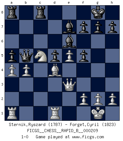 Last move : 1-0 2013 October 2 15:16:20 [Event "FICGS__CHESS__RAPID_B__000209"] [Site "FICGS"] [Date "2013.07.17"] [Round "1"] [White "Sternik,Ryszard"] [Black "Forget,Cyril"] [Result "1-0"] [WhiteElo "1787"] [BlackElo "1823"] 1.e4 c6 2.d4 d5 3.e5 c5 4.dxc5 e6 5.Be3 Nh6 6.c3 Nd7 7.Bb5 Nf5 8.Bd4 a6 9.Bd3 Nxc5 10.Bxf5 exf5 11.Ne2 Be7 12.O-O O-O 13.Nf4 Ne6 14.Qf3 Nxf4 15.Qxf4 Be6 16.Qe3 Qd7 17.Nd2 b5 18.Nb3 Rfc8 19.Rfd1 b4 20.cxb4 Bxb4 21.a3 Be7 22.Nc5 Qb5 23.b4 a5 24.a4 1-0 This chess game has been lost on time (started : 2013.07.17 21:17:33) Caro-Kann : Advance variation Kingside Castling by player White (move 12) Kingside Castling by player Black (move 12) Player White won this chess game. Follow this game move after move (download)Of Chess it has been said that life is not long enough for it, but that is the fault of life, not Chess. (William Ewart Napier) Ich kenne Menschen, die allen Willen der Welt besitzen und doch nicht Schach spielen können. (Robert James Fischer) ¿Esta Bobby Fischer algo cuerdo?. (Salo Flohr) Aux échecs, l'amour-propre est satisfait quand on remporte la victoire, mais il n'y a pas de honte à être battu. (Benjamin Franklin) Difficult things take a long time, impossible things a little longer. (Author unknown)