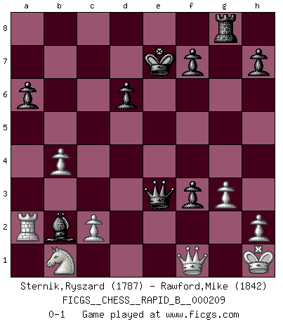 Last move : 0-1 2013 August 2 11:11:4 [Event "FICGS__CHESS__RAPID_B__000209"] [Site "FICGS"] [Date "2013.07.17"] [Round "1"] [White "Sternik,Ryszard"] [Black "Rawford,Mike"] [Result "0-1"] [WhiteElo "1787"] [BlackElo "1842"] 1.e4 c5 2.Nf3 Nc6 3.d4 cxd4 4.Nxd4 Nf6 5.Nc3 e5 6.Ndb5 d6 7.Bg5 a6 8.Na3 b5 9.Bxf6 gxf6 10.Nd5 f5 11.exf5 Bxf5 12.Bd3 Be6 13.Be4 Bg7 14.Nf6+ Bxf6 15.Bxc6+ Ke7 16.Bxa8 Qxa8 17.O-O b4 18.Nb1 Rg8 19.f3 Bh3 20.g3 Qa7+ 21.Kh1 Bxf1 22.Qxf1 Qe3 23.a3 e4 24.axb4 Bxb2 25.Ra2 exf3 0-1 Sicilian : Pelikan (Lasker/Sveshnikov) variation Kingside Castling by player White (move 17) Player Black won this chess game. Follow this game move after move (download)Fischer is under obligation to nobody. (Joseph Platz) Ein Kibitz ist einer, der deinem Gegner gute Ratschläge gibt. (Andrew Soltis) Yo nunca en mi vida he jugado la Defensa Francesa, que viene siendo la más aburrida de todas las Aperturas. (Wilhelm Steinitz) Mon pion favori sur ma case favorite ! Bronstein en parlant d'un coup de pion en h5 quand il avait les Noirs. Knowledge rests not upon truth alone, but upon error also. (Carl G. Jung)